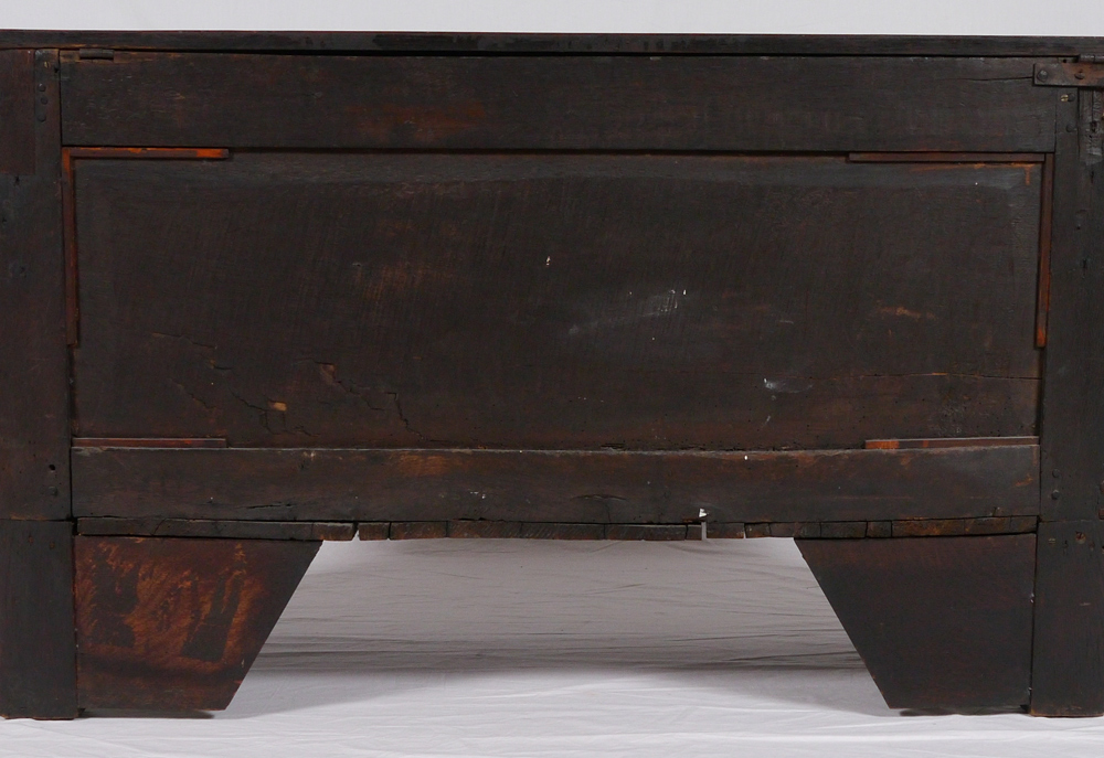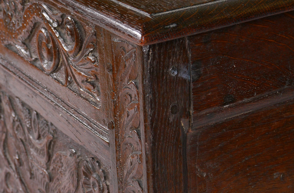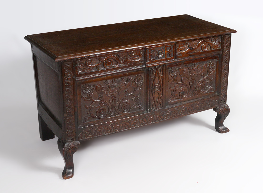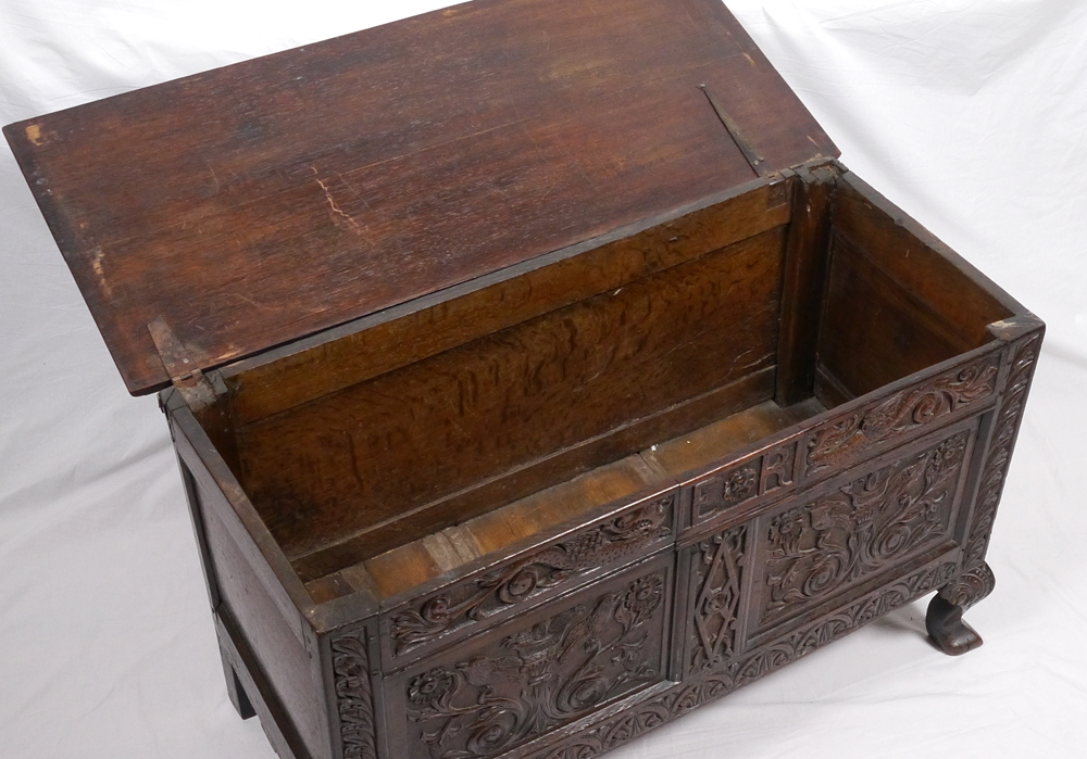 ENGLISH JACOBEAN STYLE OAK BLANKET CHEST: Late 18th to early 19th century, carved front in the Jacobean style with panels featuring figural dragons, foliate and floral motifs, initials ''ER''. Overall measures 27 1/4'' h. x 45 3/4'' h. x 19 3/4''.