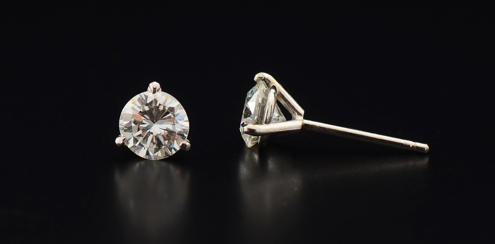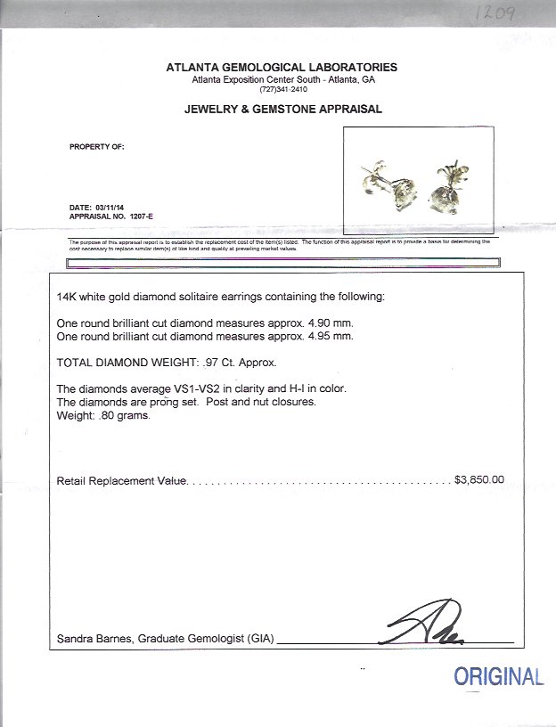 DIAMOND STUD EARRINGS: 14K white gold Martini style stud earrings of 2 round brilliant cut diamonds totaling approx. .97 Ct., measuring 4.0 mm and 4.95 mm., VS1-VS2 in clarity, and H-I color. Prong set, post and nut closure. Weight .80 grams. Sold with current Atlanta Gemological GIA graduate's appraisal for $3,850.