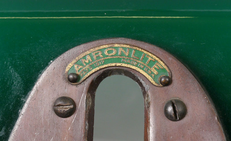 AMRONLITE CASED GREEN SHADE DESK LAMP: Heavy cast metal base, single socket fixture. Molded green cased glass shade marked Amronlite, Pat. 1917, Made in USA. Overall measures 11 1/2'' h. x 11 1/4'' x 9 1/2'' with shade on.