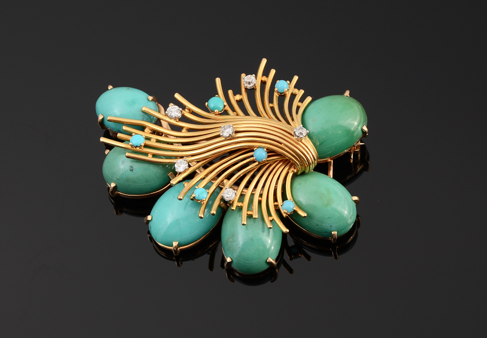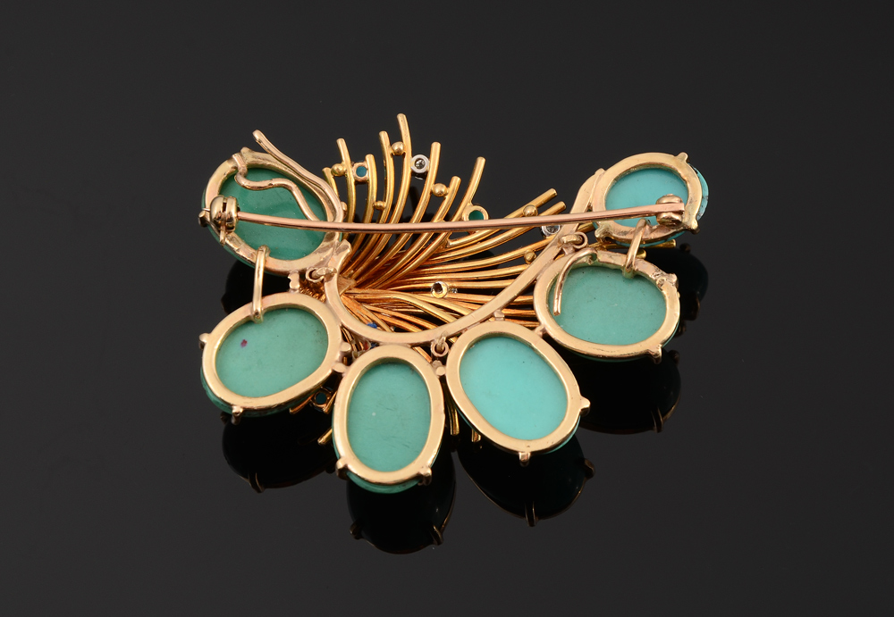 TURQUOISE & DIAMOND BROOCH: 14K yellow gold brooch of 12 oval and round cabochon cut pieces of turquoise and 6 round brilliant cut diamonds. Diamonds total approx. .30 Ct., rated SI in clarity and H-I in color. The turquoise and diamonds are prong set. Mounting weight: 15.0 grams approx.