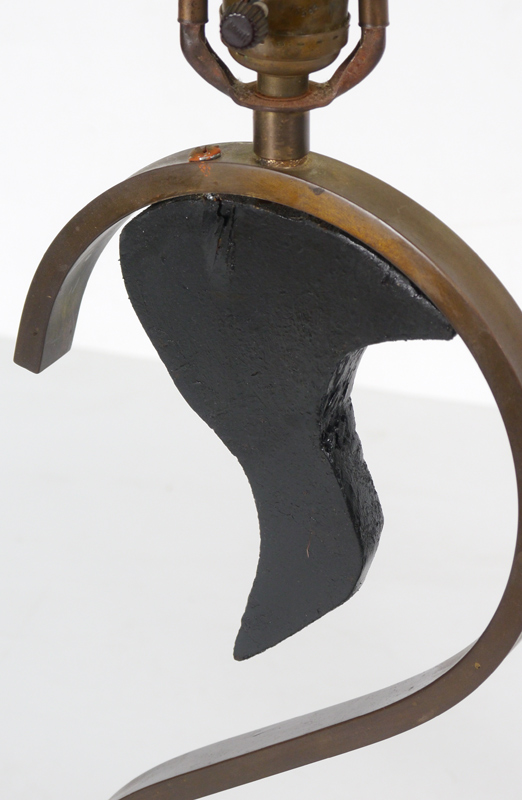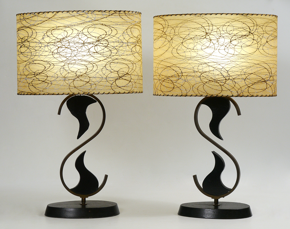 PAIR 1950'S MID CENTURY TABLE LAMPS: Painted wood base, body with painted wood stylized birds, brass scroll support, single socket fixture. Overall measures 29'' h. x 11'' x 6 3/4''. Sold with oval shades 11 1/2'' h. x 18'' x 11''.