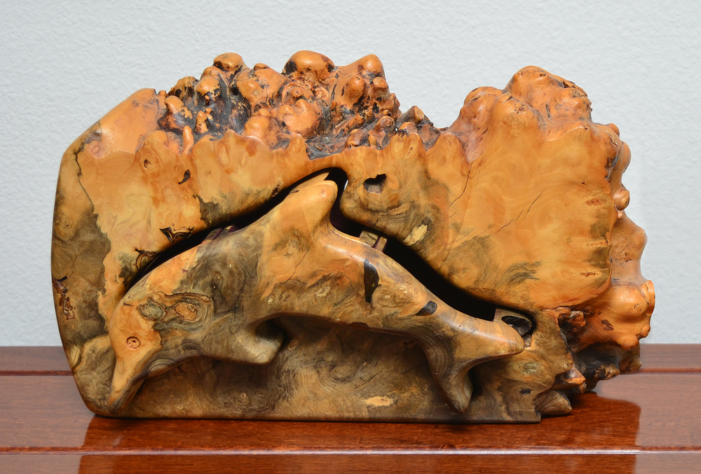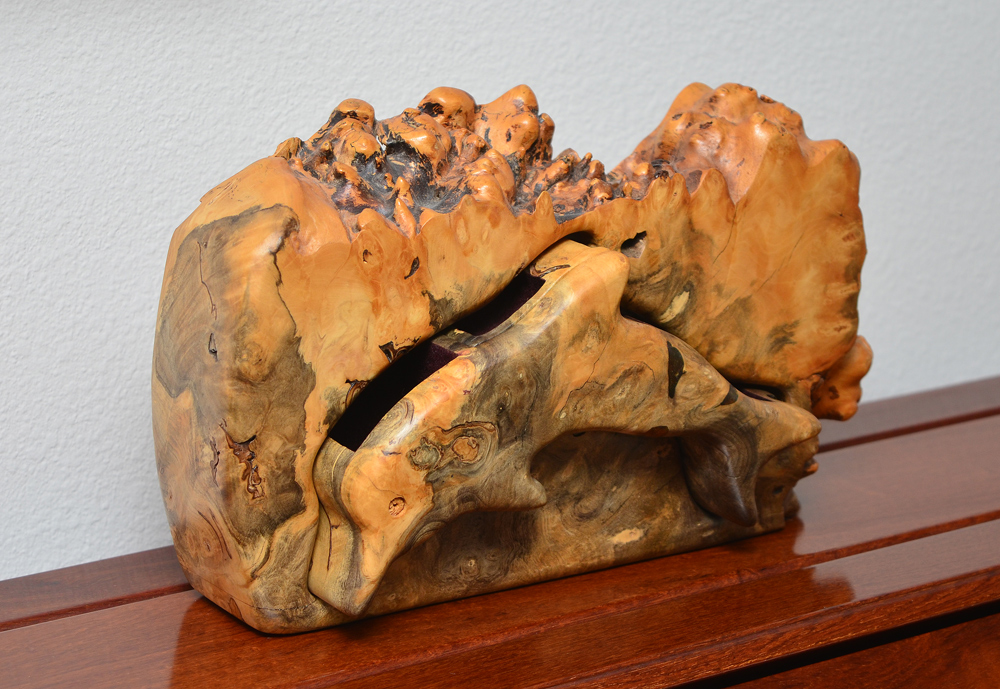 BURL WOOD FIGURAL DOLPHIN JEWEL BOX: Free form case, single drawer carved in the shape of a dolphin with 3 compartments. 7 1/2'' h. x 12 3/4'' x 3''.