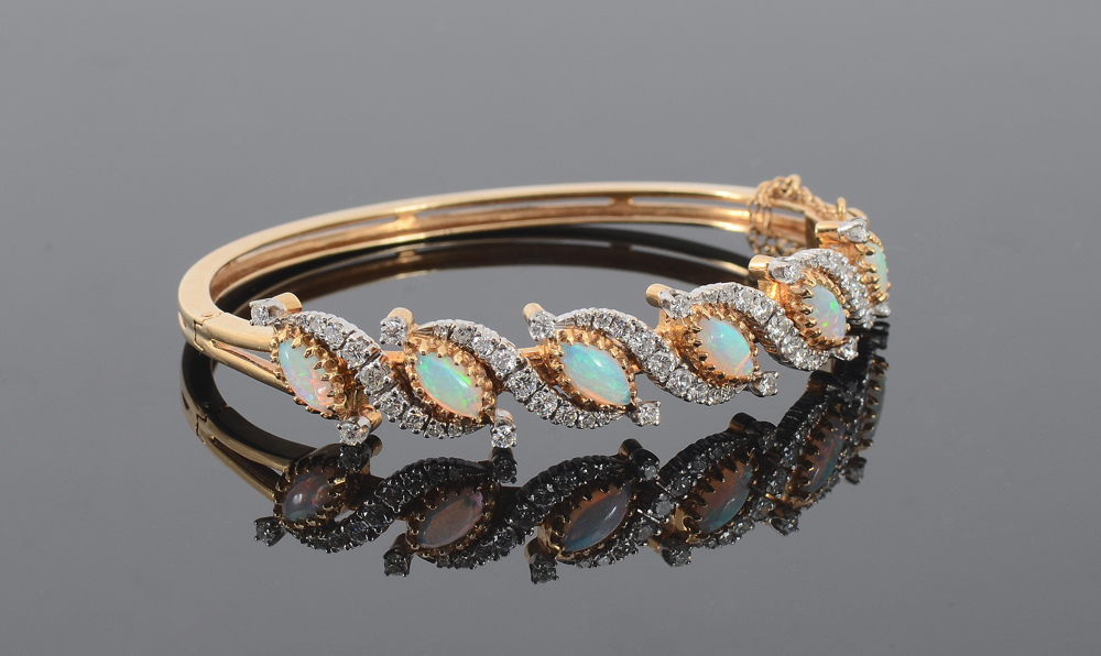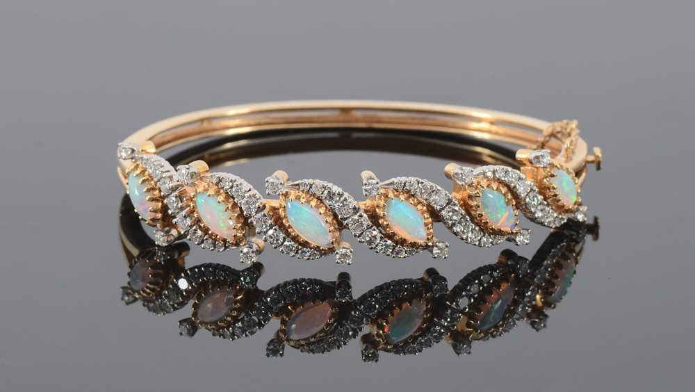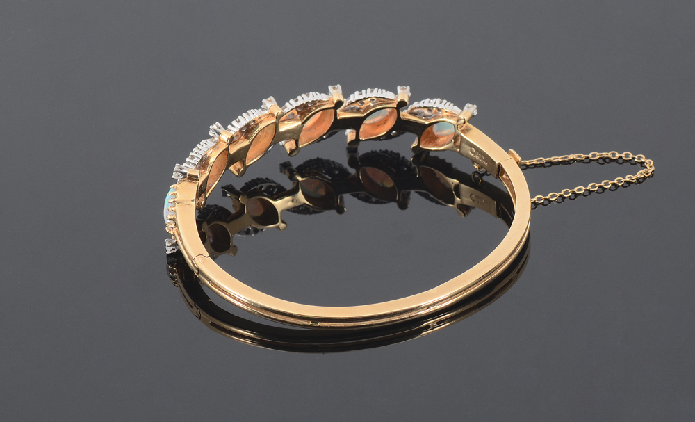 OPAL AND DIAMOND BANGLE BRACELET: 14K yellow gold hinged bangle bracelet with 6 marquise opals alternating with rows of 57 single and round full cut diamonds totaling approx. 1.65 Ct., H-I color and SI clarity. 2 1/4'' inside diameter. Weight 23.4 grams.
