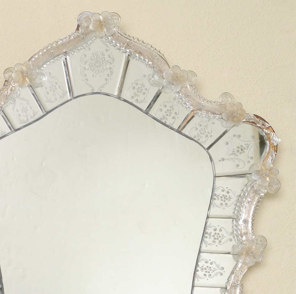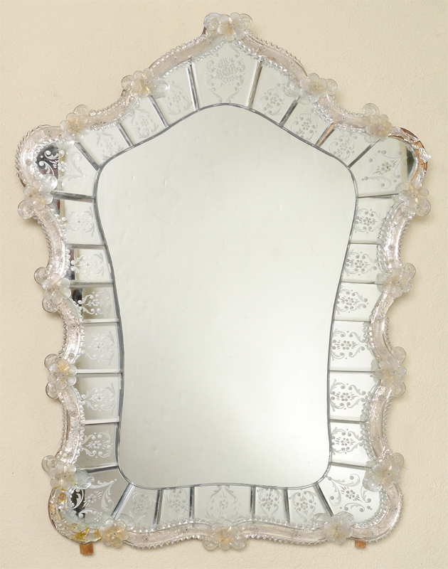 VENETIAN WALL MIRROR: Applied shaped glass trim with rosettes decoration, paneled outer rim of mirror with etched glass designs. Overall 34 3/4'' h. x 2 1/4'' x 1''.