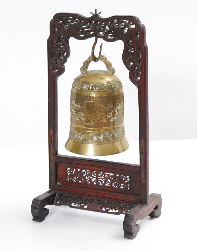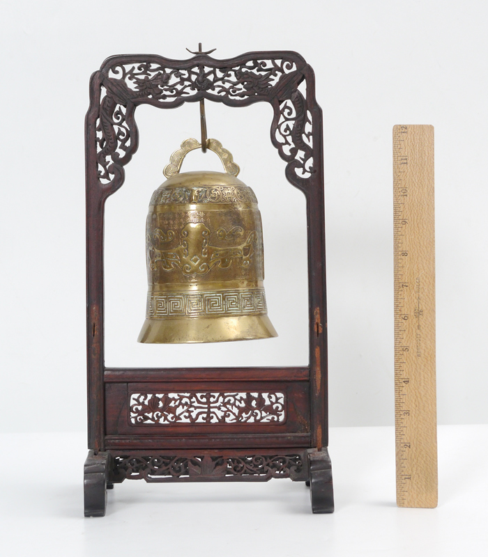 CHINESE BRASS TEMPLE BELL ON STAND: Bell with cast geometric and figural motifs. Carved and pierced wood stand. Bell measures 6 1/2'' h. x 4 5/8'' dia., stand 15'' h. x 7 3/4'' h x 5 1/2''.