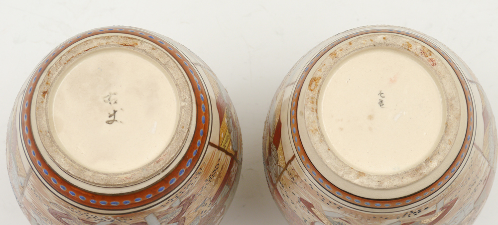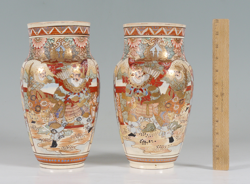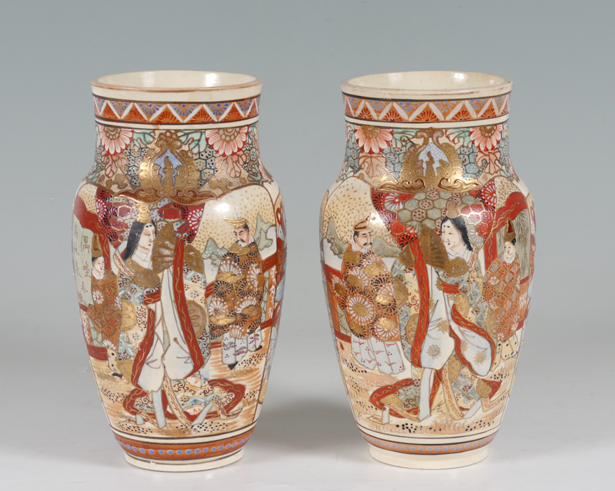 PAIR 20TH CENTURY JAPANESE SATSUMA VASES: Early to mid-20th century, near mirror image design of typical genre scenes, unknown makers mark on base. Overall measures 11 3/4'' h. x 6 1/2''.