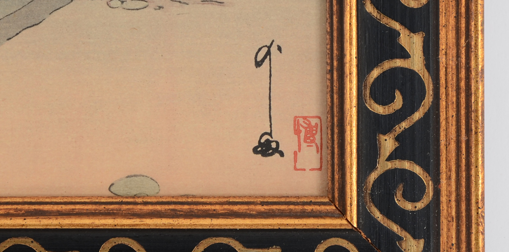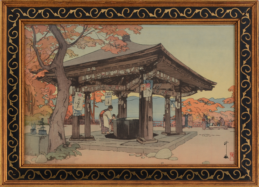 HIROSHI YOSHIDA WOODBLOCK VILLAGE SCENE: 9 7/8'' x 14 5/8'', custom frame, 12 1/2'' x 17 1/2''.
