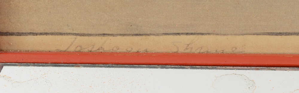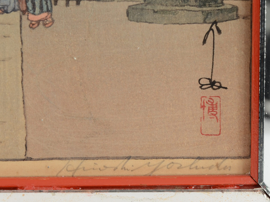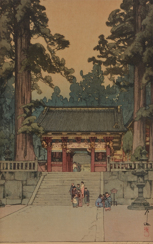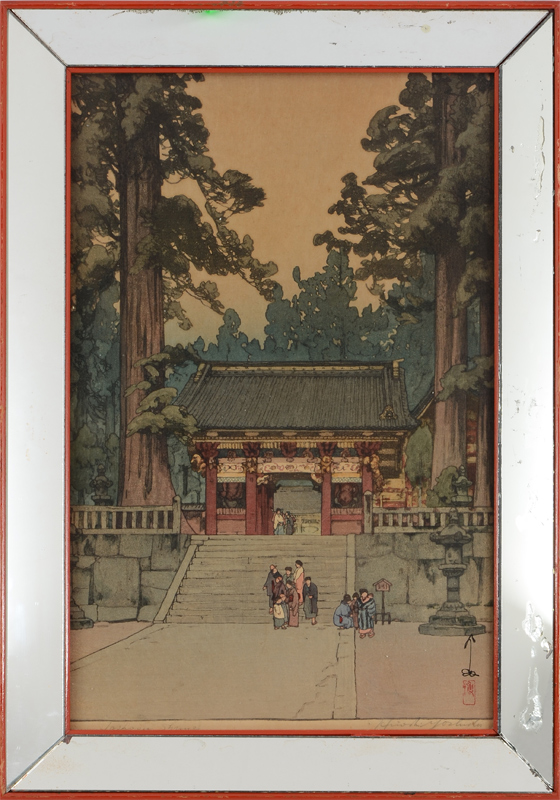 HIROSHI YOSHIDA WOODBLOCK: Shrine at Toshogu, sight size 15'' x 9 1/2'', pencil signed lower right, titled lower left, custom painted and mirrored frame, 18'' x 12 3/4''.