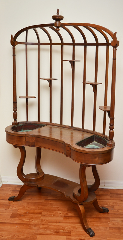 UNUSUAL WALNUT FOYER PLANT STAND: Open slat grotto shaped curved stand with 5 small plant shelves, main surface inset with two copper pans, overall to top of center finial 69''h., 42'' wide and approx. 17.5'' deep.