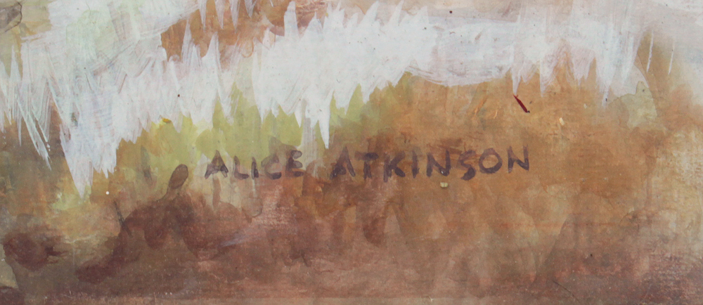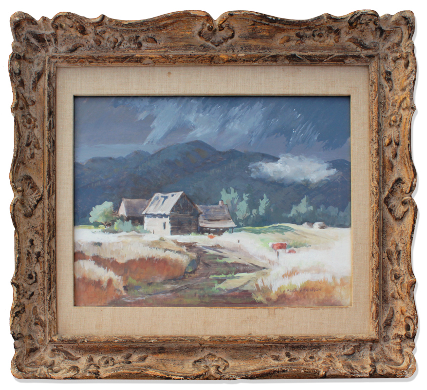 ATKINSON, Alice, (American, 20th Century): Western Landscape Painting with Mountains and Cabin as the Storm Approaches, Gouache, Sight size 14'' x 19 1/2'', signed lower right, pierce carved and painted gesso frame 24 1/2'' x 28''.