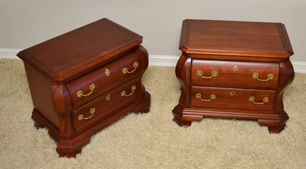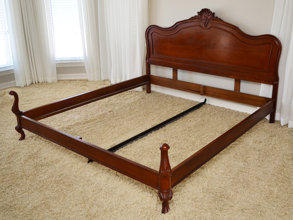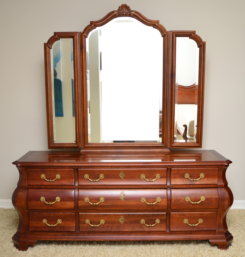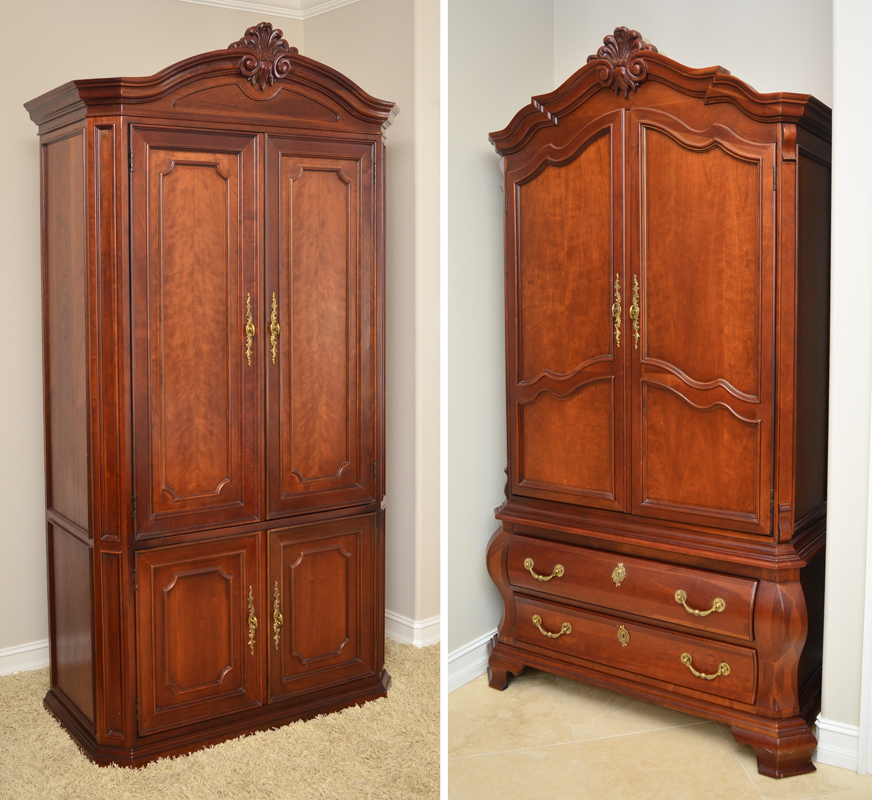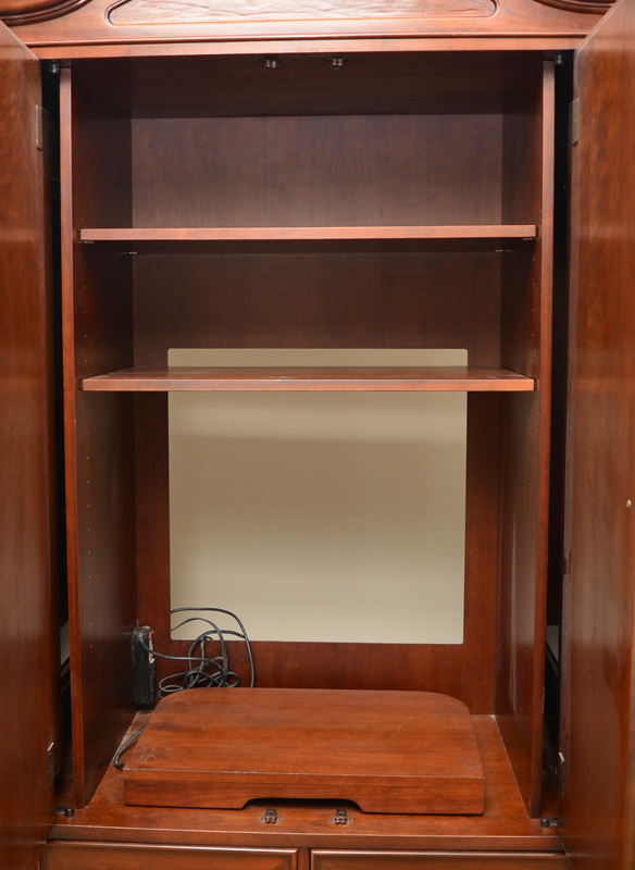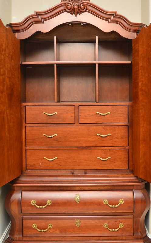 6 PIECE CENTURY FURNITURE BEDROOM SUITE: Mahogany suite to include king size bed (54 1/2'' x 80'' x 1 3/4'', foot board (24 1/2'' h.), pair night stands with protective glass tops (25 1/2'' h. x 33 1/2 x 19 1/2''), Armoire (86 1/4'' h. x 50 1/2'' x 22''), media cabinet (90 1/2'' h. x 48'' x 23 1/2''), and triple front dresser with gull wing mirror.
