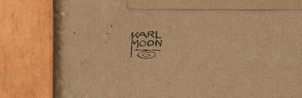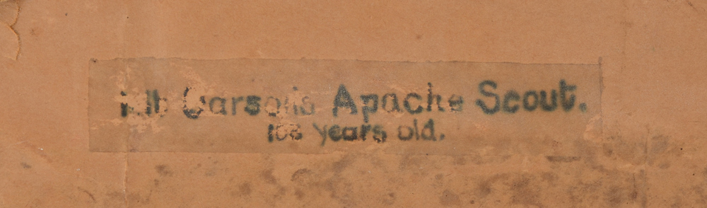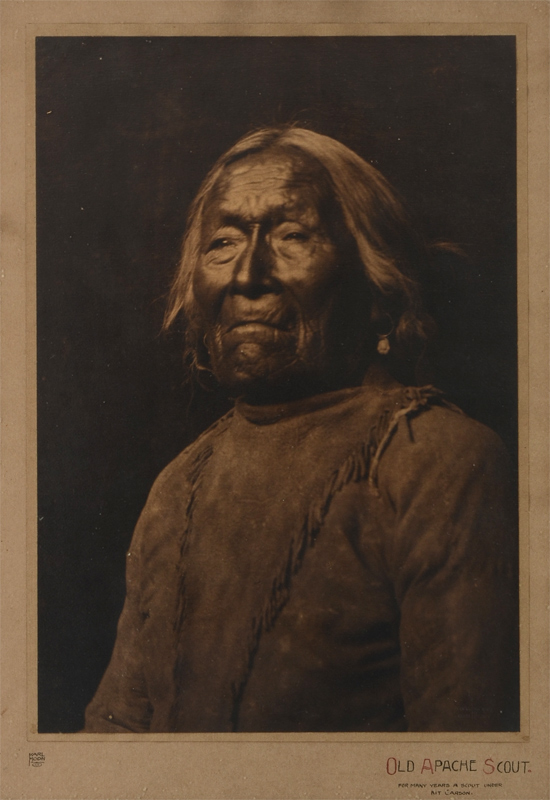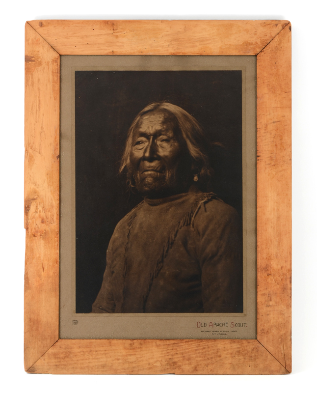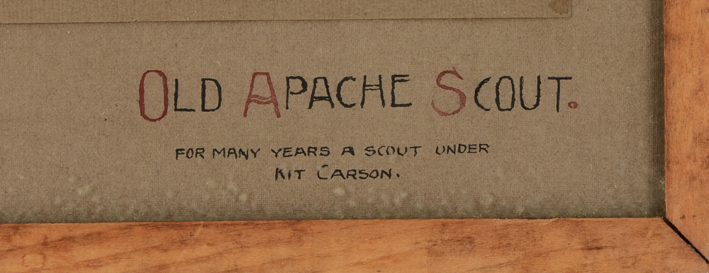 MOON, Karl Everton, (American, 1878-1914): ''Old Apache Scout'', Photograph, signed lower left, embossed copyright 1909 by Fred Harvey lower right hand corner, handwritten title lower left ''Old Apache Scout''. The photo depicts Nar-ah-re-ge-estu, a Jicarilla Apache scout for many years with Kit Carson. He lived to be 108 years old. Sight size 19 1/2'' x 13 1/2''. Encased in original worn frame. 24 1/2'' x 11/2''. Provenance: Acquired by the present owner directly from Mary Stevenson Morgan, niece of Karl Moon.