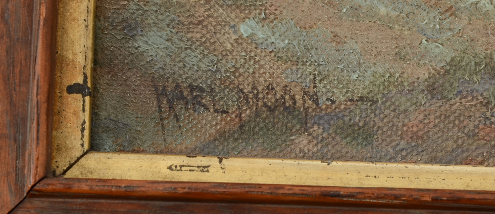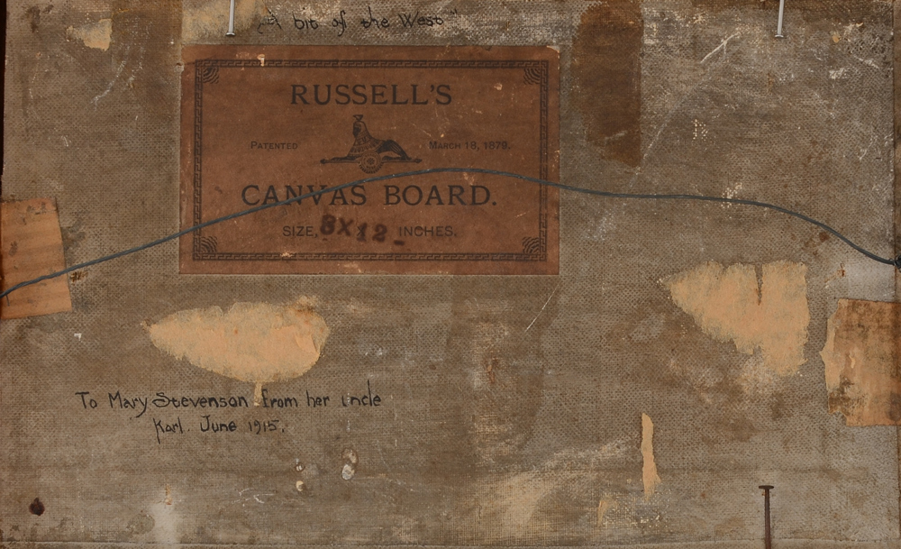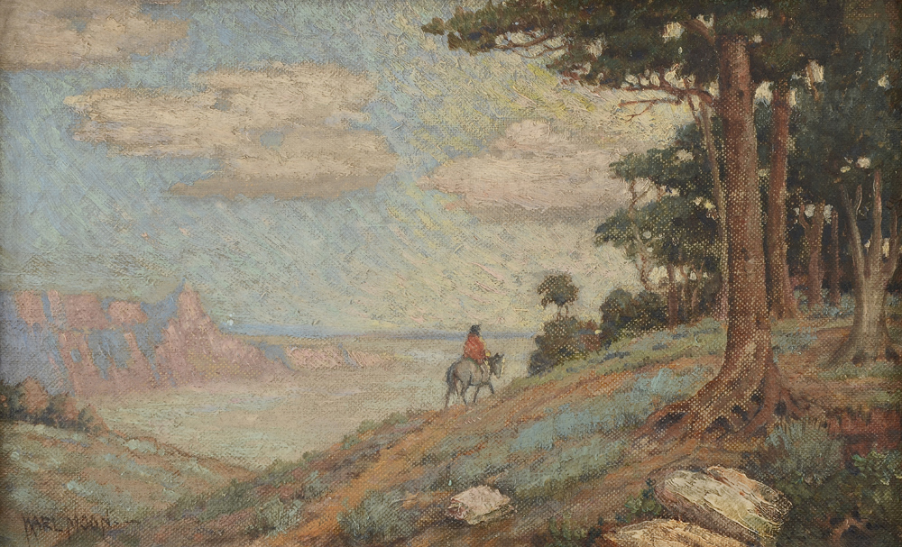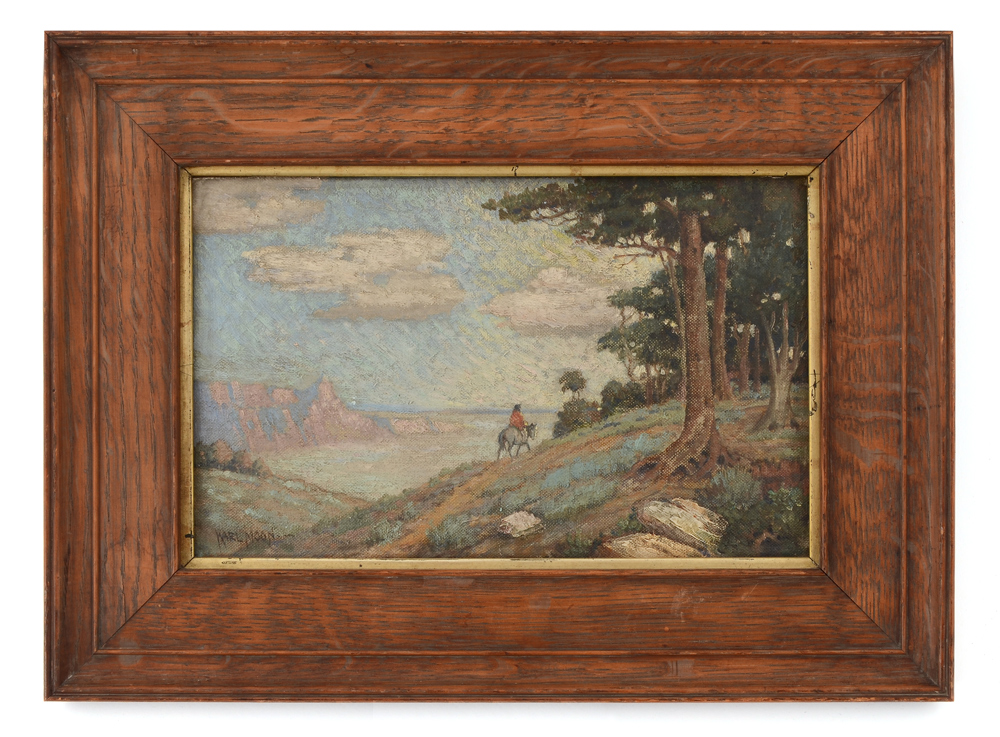 MOON, Karl Everton,(American, 1878-1914): ''A Bit of the West'', Indian on Horseback in a Vast Western Landscape, Oil/Canvasboard, 6'' x 9 1/2'', signed lower left, Karl Moon, ''dedicated to Mary Stevenson from her Uncle Karl, June 1915, titled verso, custom original quarter sawn oak frame with gilded trim liner 10'' x 13 5/8''. Provenance: Acquired by the present owner directly from Mary Stevenson Morgan, niece of Karl Moon.