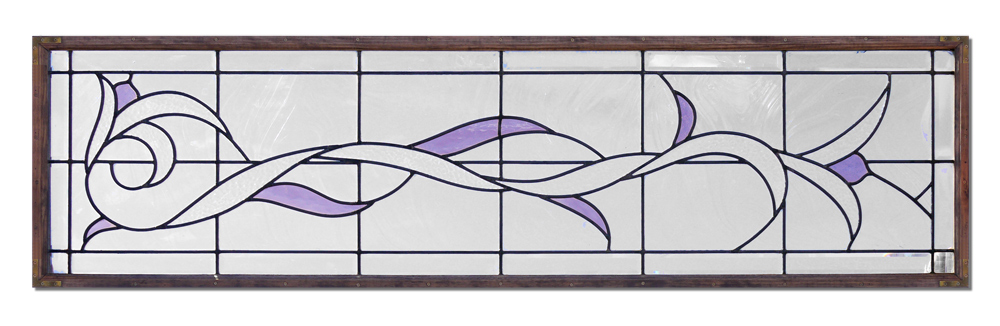 CONTEMPORARY STAINED GLASS WINDOW: Foliate design with pink accent glass, wood frame, overall measures 80'' x 21 1/2'' x 1 1/2''. Layered with a panel of tempered glass, for safety.