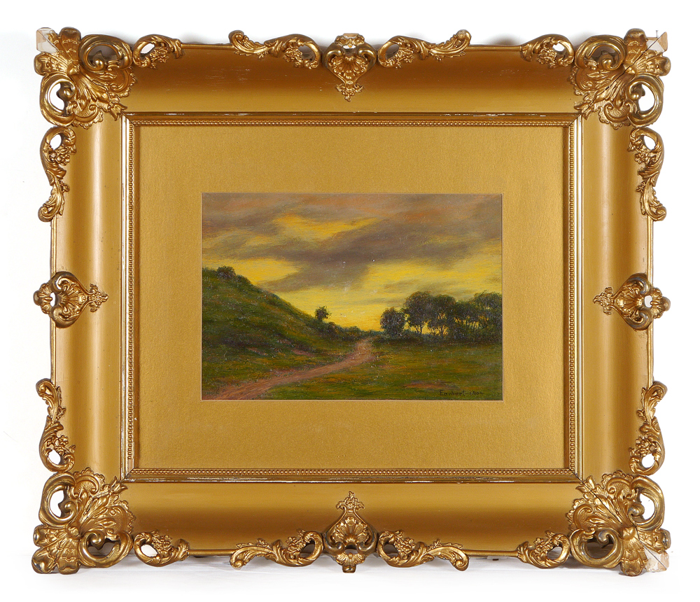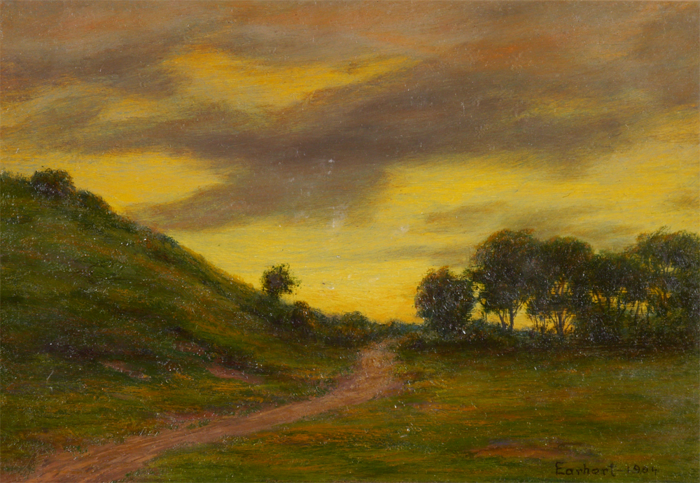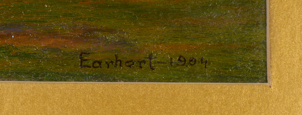 EARHART, John, (American, 1853-1938): Sunrise Landscape, Oil/Board, sight size 6'' x 9'', signed lower right and dated 1904, gilded and pierce carved frame, 16 1/2'' x 19 1/2''.