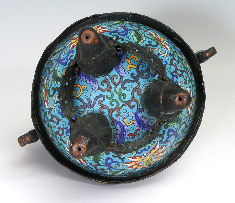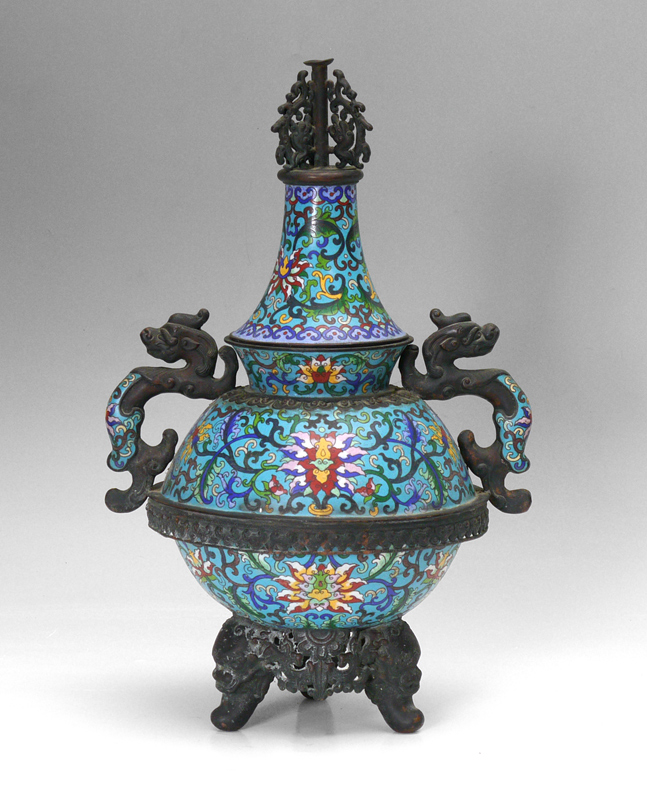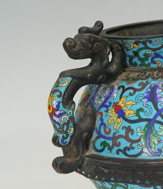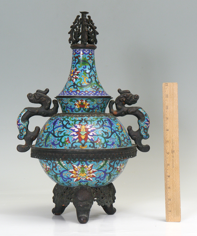 CHINESE CLOISONNE DOUBLE HANDLED CENSER: Lid with cast figural dragon finials, body with double stylized dragon handles, cast base. Floral cloisonne decoration all over, 18 1/2'' h. x 12''.