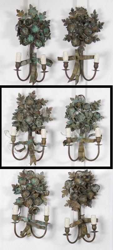 PAIR FRENCH METAL SCONCES: Salvaged and purchased from a hotel in Saint Tropez, France. Electrified 2 socket sconces, patinated metal with floral blooms and ribbon decoration. Overall measures 17'' h. x 9 1/2'' x 5''.