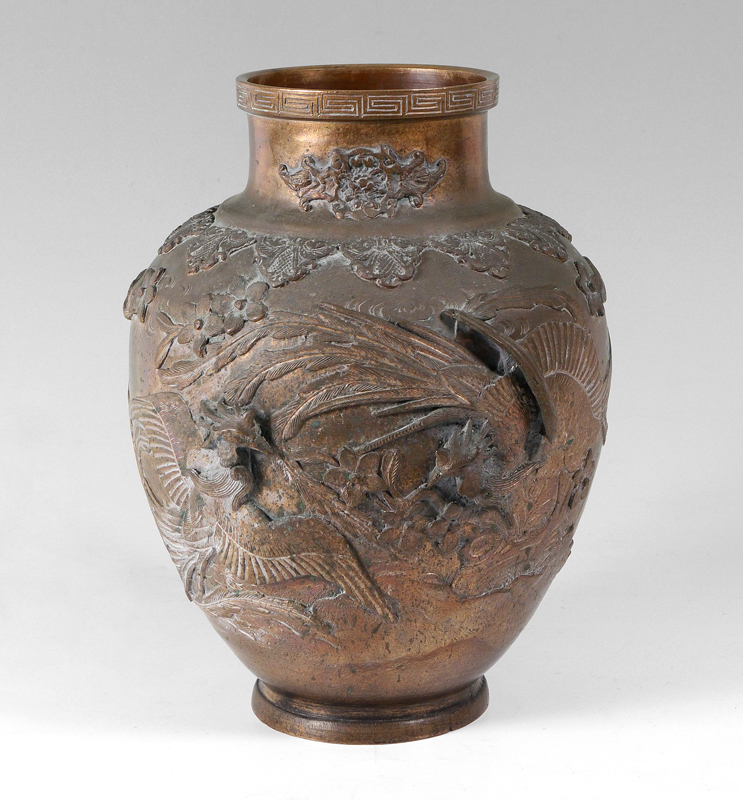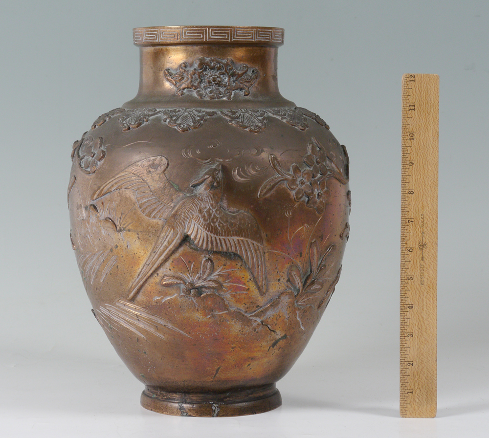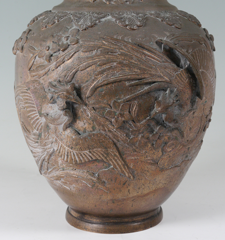 ORIENTAL BRONZE FIGURAL VASE: Relief cast with figural birds in combat and floral motifs. No visible markings. Overall measures 13 3/4'' h. x 10 1/2''.