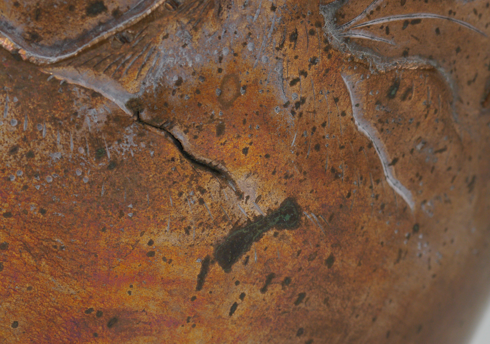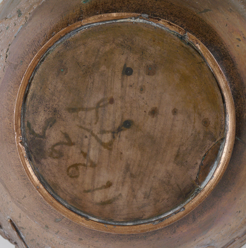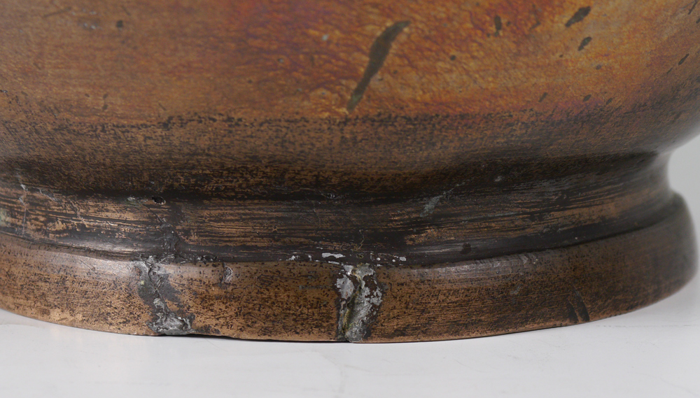 CONDITION: Several splits visible from the interior. Uneven patina to surface.