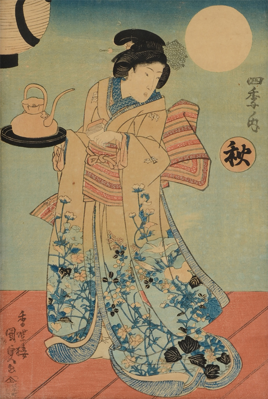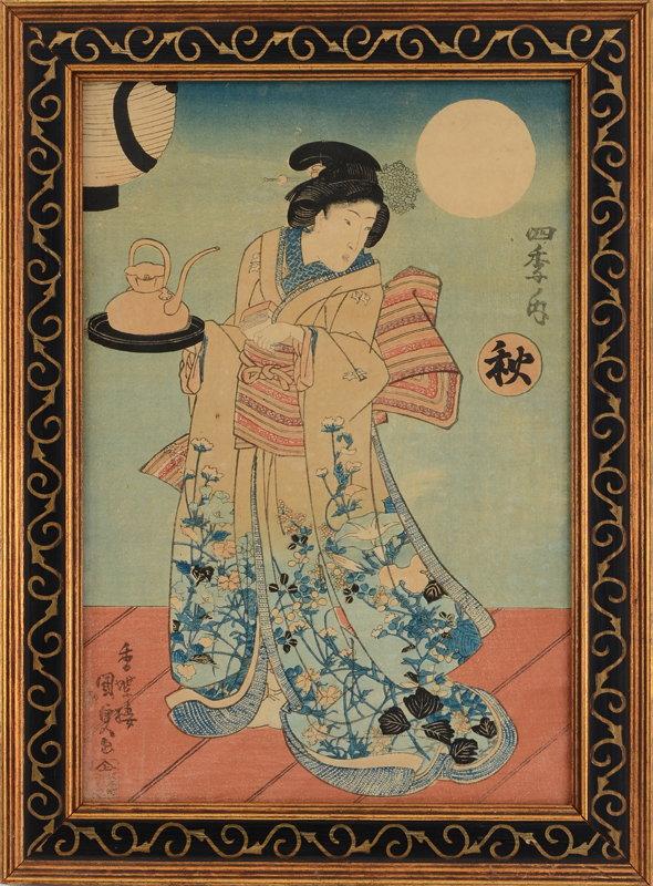 19TH CENTURY JAPANESE WOODBLOCK PRINT OF GEISHA: Sight size 14 1/4'' x 10 1/2'', custom frame, 17 1/2'' x 12 3/4''.