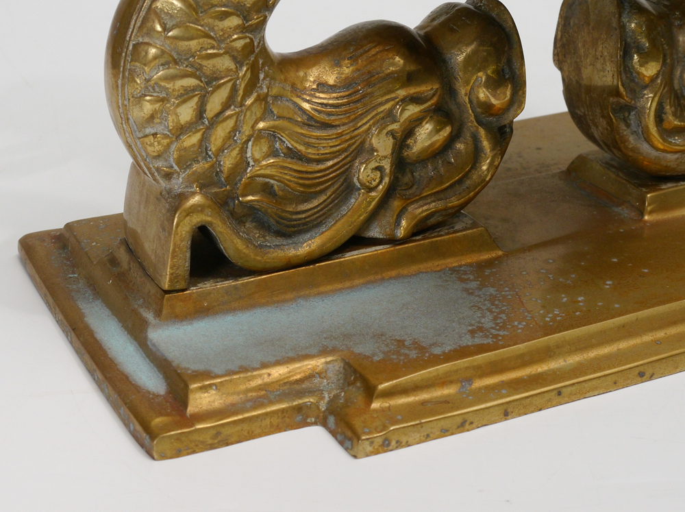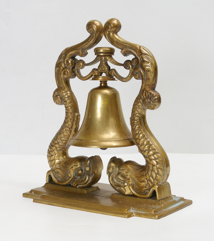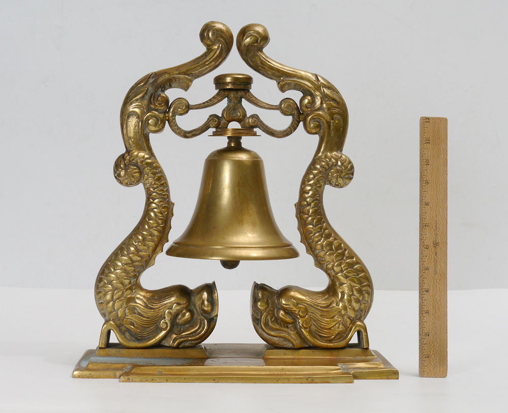 LARGE HEAVY BRASS FIGURAL DOLPHIN BELL: 20th century production, heavy cast base and frame with 2 figural dolphin supports, central bell. Measures 16 1/2'' h. x 14 3/4'' x 8 1/4''.