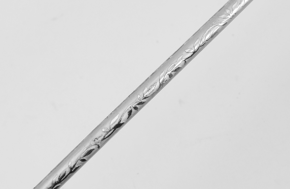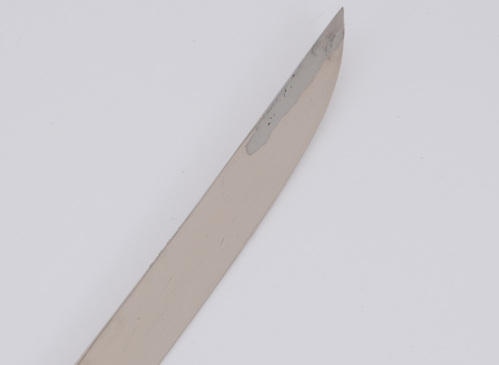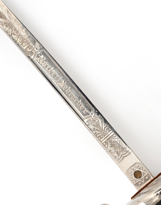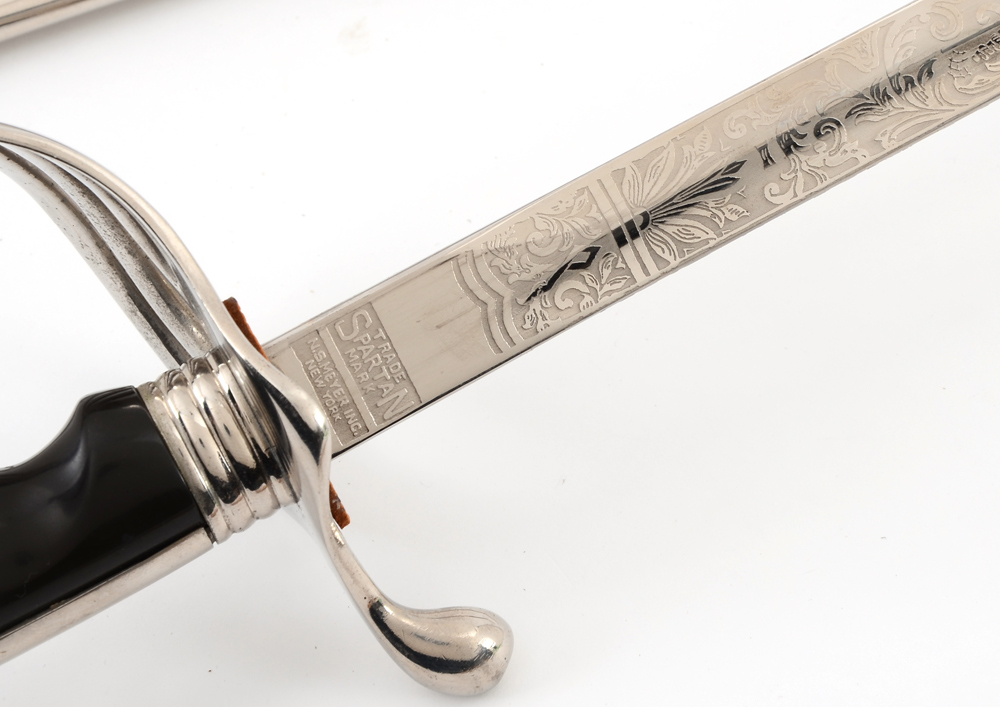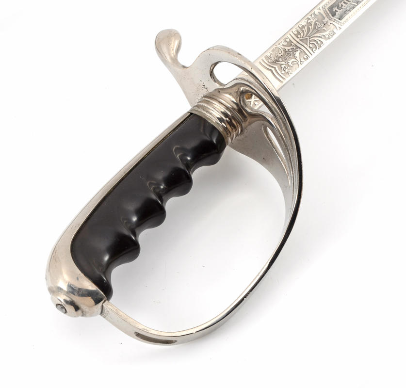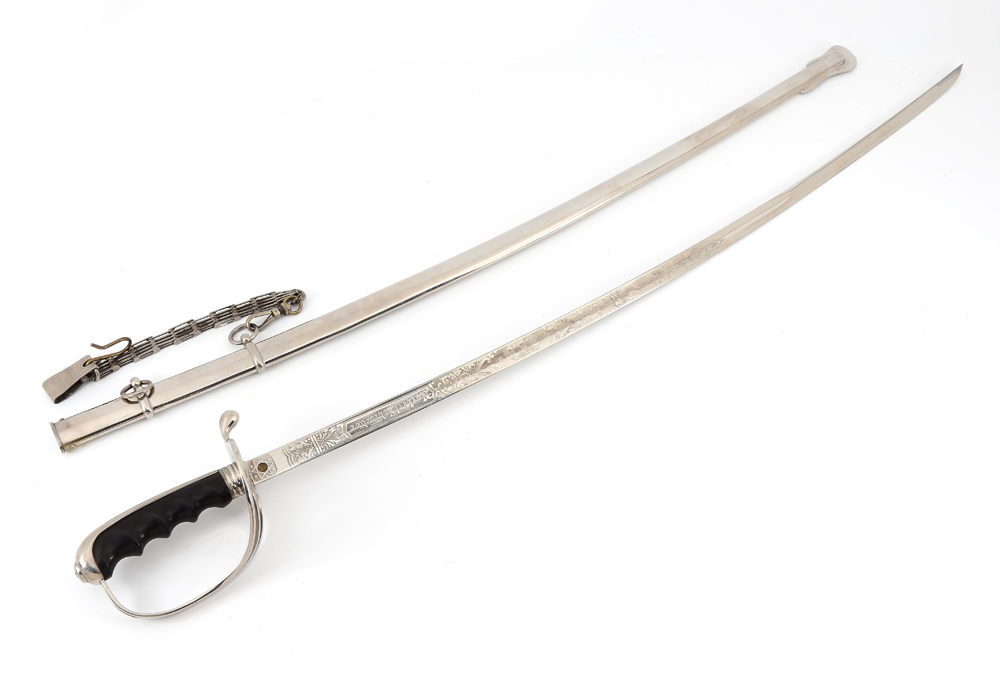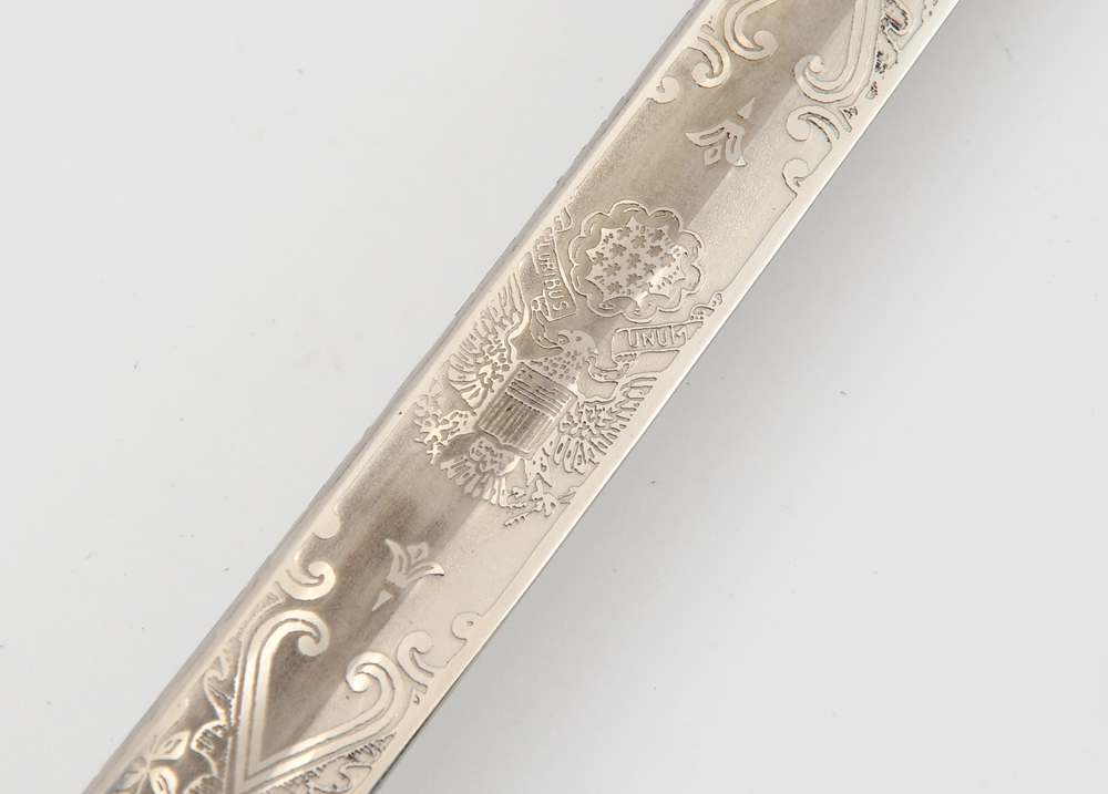 US ARMY MODEL 1902 OFFICERS SWORD: Nickeled hilt with hard plastic grip, minty 31 3/4'' blade by NS Meyer, original owners name engraved in panel, other military etchings. Nickeled scabbard with original hanger chain, overall 38 1/2''.