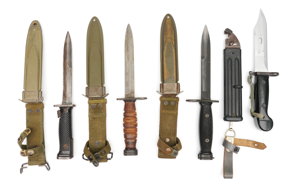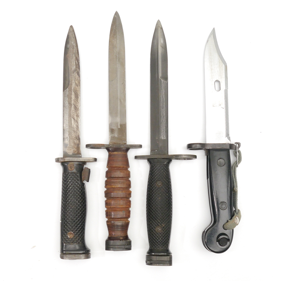 COLLECTION OF 4 US ARMY MILITARY BAYONETS / KNIVES: An assembled collection from WWII to Vietnam, to include M4 in M8A1 sheath, M6 in M8A1 sheath, M7 in M8 sheath, AKM.