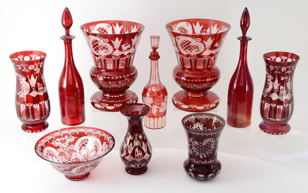 10 PIECE BOHEMIAN RUBY CUT TO CLEAR GLASS: An assembled collection, several have original Egerman Czech Republic foil labels. To include decanters with stoppers, vases and centerbowl. Largest vase measures 10 7/8'' h. x 8 1/2'' dia.