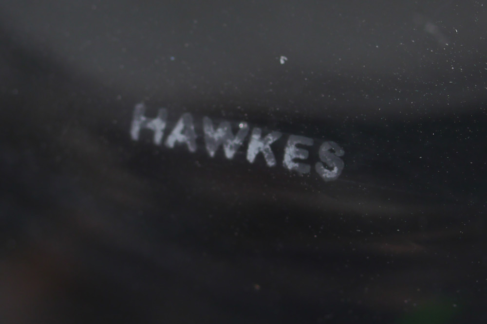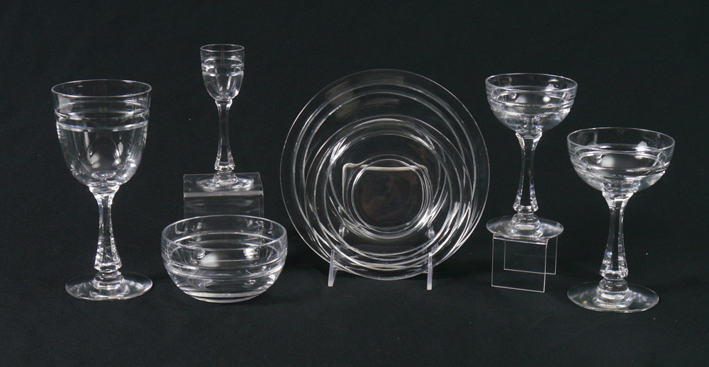 SIGNED HAWKES DRUID CRYSTAL SERVICE: Approx. 70 pieces in the Druid pattern by Hawkes to include 12 water glasses (7 3/8''), 12 champagne (5 5/8''), 12 sherbet (5 5/8''), 10 cordial (5 3/8''), 8 dessert plates (8'' dia), 8 bread plates (6 1/4''), 8 bowls (4 5/8'').