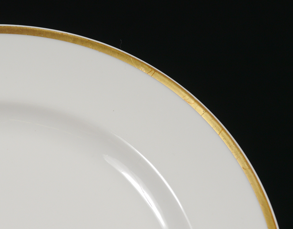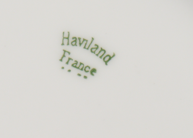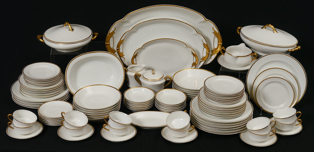 HAVILAND FRENCH LIMOGES CHINA: Approx. 93 pieces with gold trim to include 11 dinner plates (9 3/4''), 12 salad plates (7 1/2''), 12 bread plates (6 1/2''), 12 soup bowls (7 3/4''), 12 dessert bowls (5 1/8''), 12 cups and saucers, 3 platters (largest 20'' x 14 1/4''), oval covered vegetable, round covered casserole, open vegetable, gravy boat, open butter dish, open creamer and covered sugar.