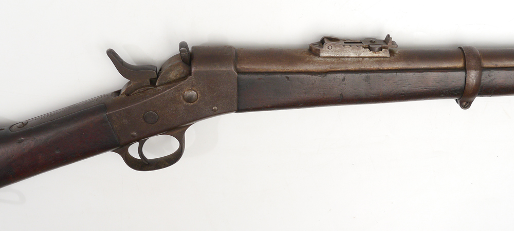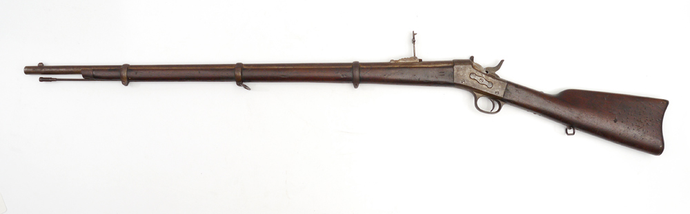 ANTIQUE REMINGTON ROLLING BLOCK RIFLE: 35 1/4'' round 3 band barrel, walnut full stock, 3 line marking on tang with last patent date of 1874. Action currently works fine. Overall 50 1/2'' long.