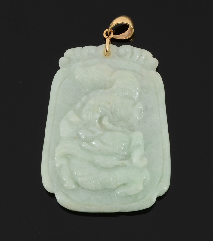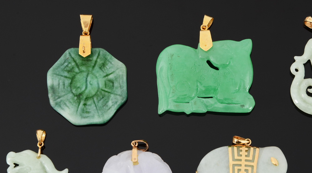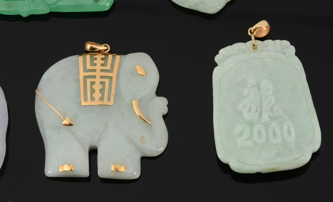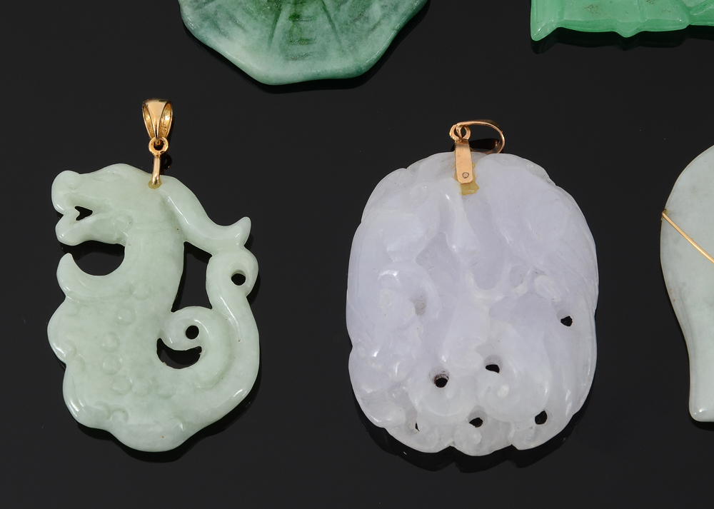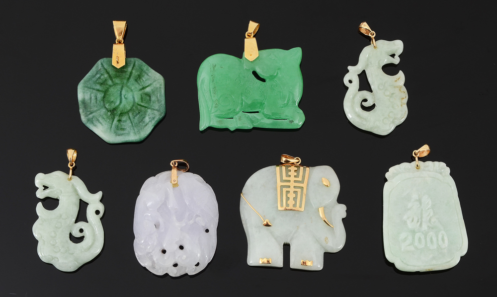 GROUP OF 7 CARVED JADEITE JADE PENDANTS: Estate found group of 7 carved pendants in graduating shades of green. Bails are stamped 1K gold. Measure approx. 1.5'' h.