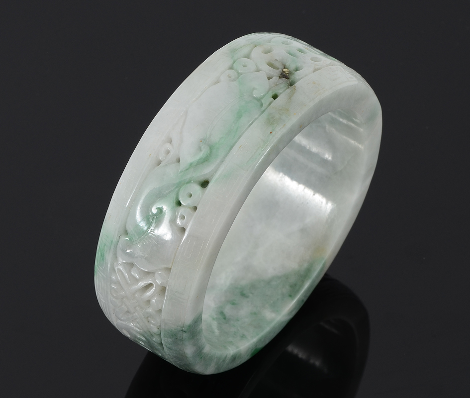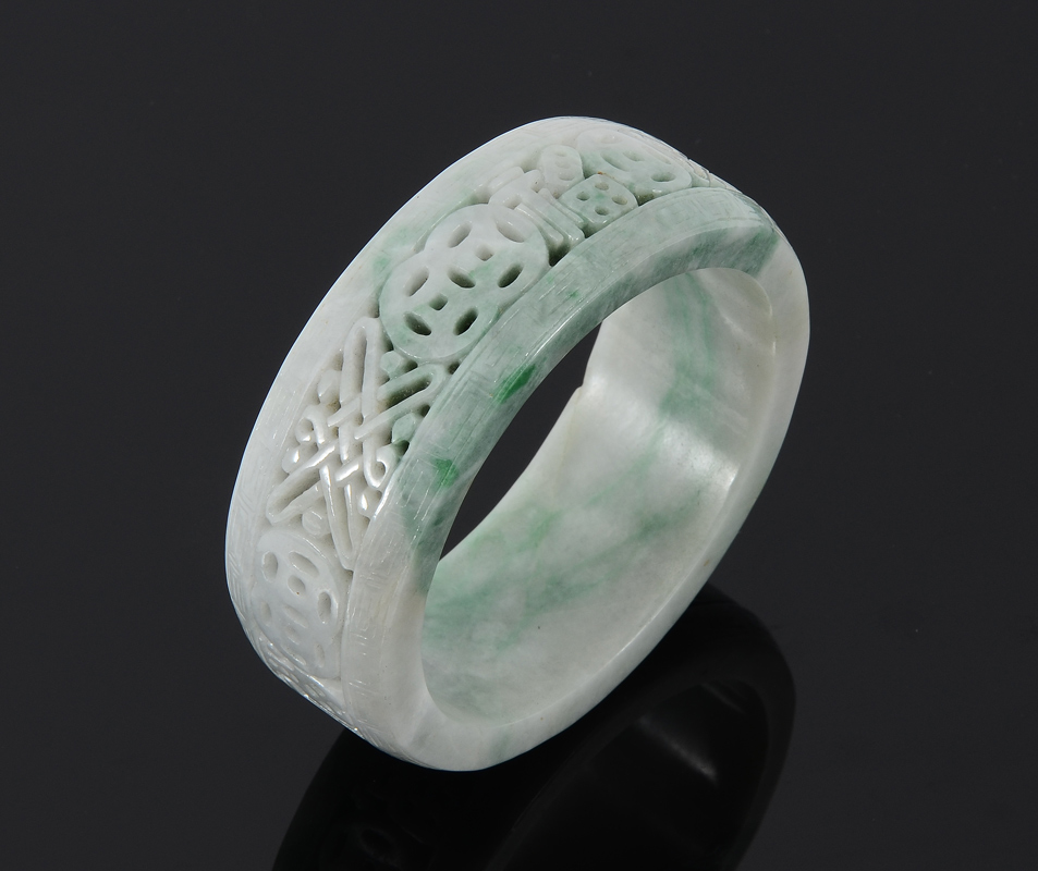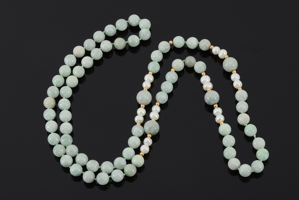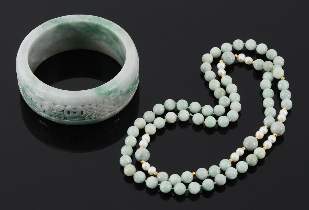 ESTATE FRESH JADEITE JADE BANGLE BRACELET AND BEADS: 1) Continuous strand bead necklace of jadeite beads, 8-10mm, with 8 pearl spacers 5 mm. Measures 32'' length. 2) A substantial carved bangle bracelet, 1 1/4'' wide, 2 5/8'' interior diameter.
