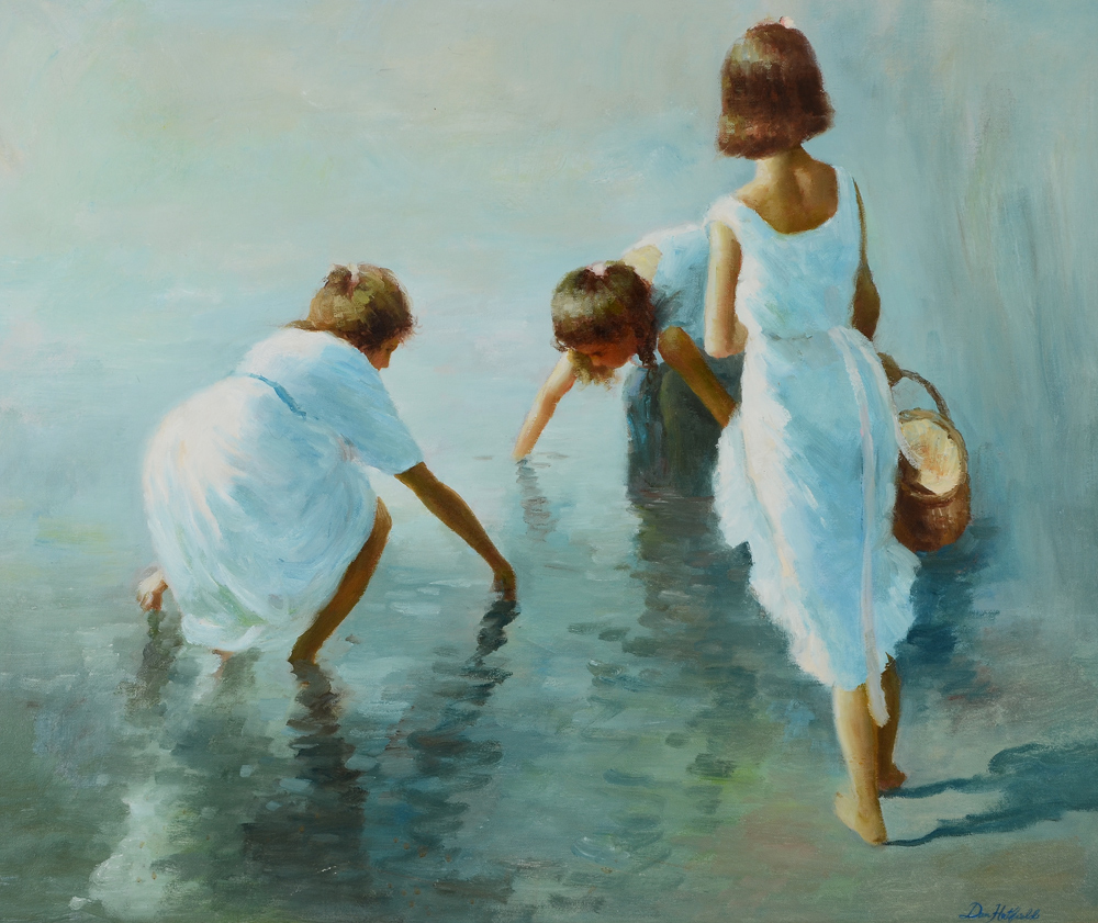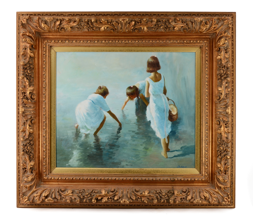 DON HATFIELD IMPRESSIONIST PAINTING CHILDREN PLAYING AT THE BEACH: Oil/Canvas, Sight size 19 1/2'' x 23 1/2'', signed lower right, fancy modern frame 33'' x 37''.