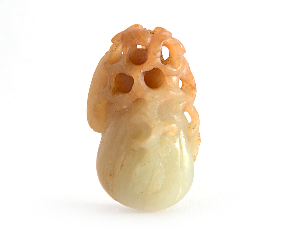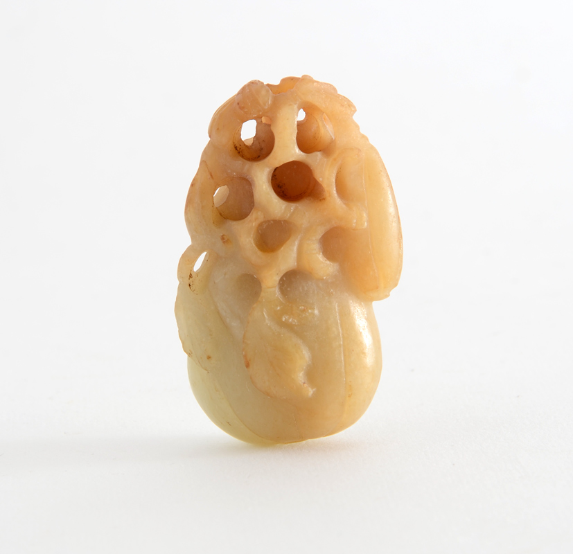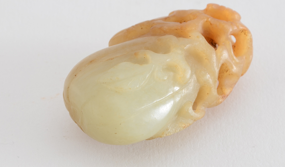 CHINESE NEPHRITE JADE CARVING OF A PEACH: Figure of a peach or plum on branch, measures 2'' x 1 1/4''.