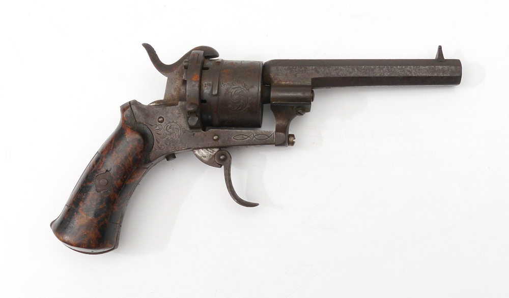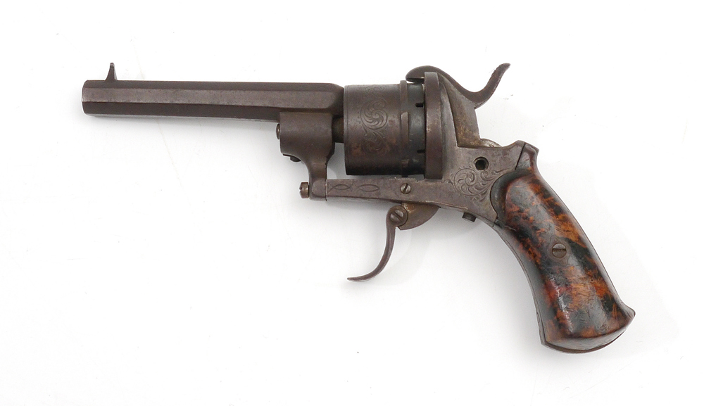 ANTIQUE PINFIRE PISTOL: Engraved frame, 6 shot cylinder and 3 3/8'' octagonal barrel. Grain painted grips, unmarked as to maker or country of origin. Action currently working. Overall measures 6 3/4''.