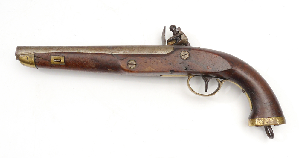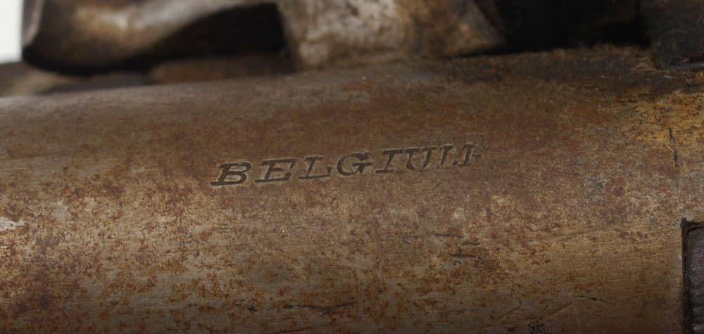 19TH CENTURY BELGIAN HOLSTER FLINTLOCK PISTOL: 9'' round large bore barrel marked Belgium, unmarked flintlock, brass furniture with lanyard ring on flat butt. Action does not hold. Overall measures 15 1/4'' long.