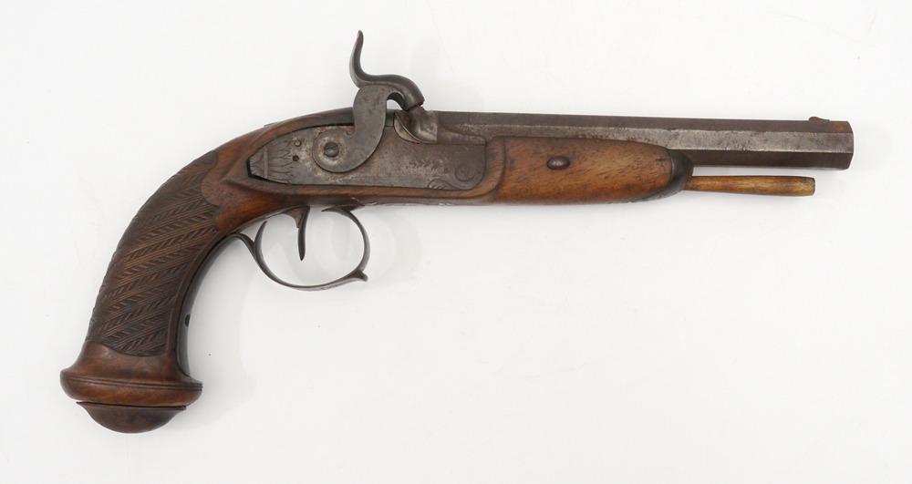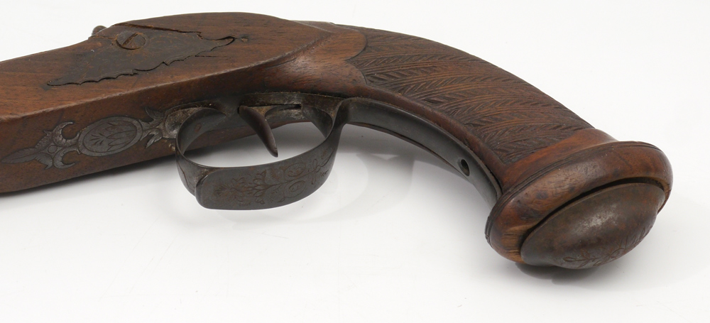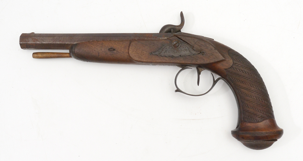 CONTINENTAL CARVED STOCK PERCUSSION PISTOL: 7 1/2'' smoothbore octagonal barrel, unmarked percussion lock. Carved walnut stock, engraved iron furniture, action currently working. No visible markings, most likely French. Overall measures 12 1/2''.