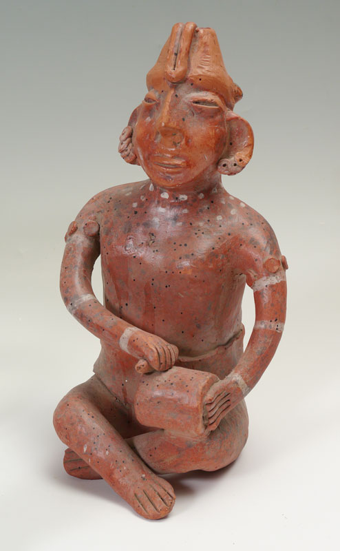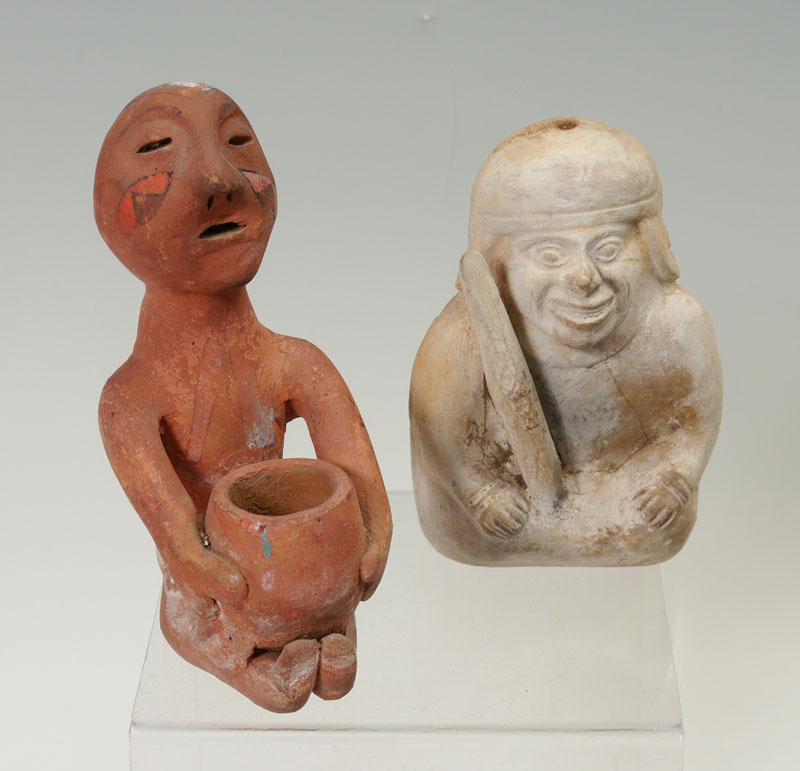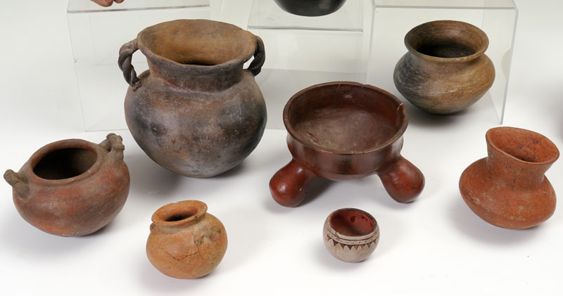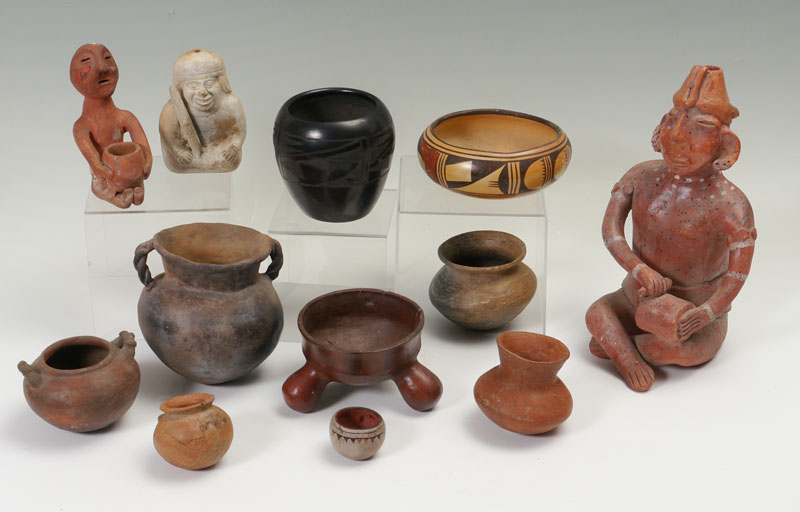 COLLECTION OF SOUTHWESTERN & PRE-COLUMBIAN POTTERY: A large assortment of approx. 12 pottery vessels and effigies ranging from San Ildefonso black on black vase to large figural Mexican effigies to South American vessels. Ages varies and cannot be guaranteed, tallest effigy measures 12 3/4'' h. x 7'' x 7'', smallest pot 1 1/2'' h. x 2 1/4''.