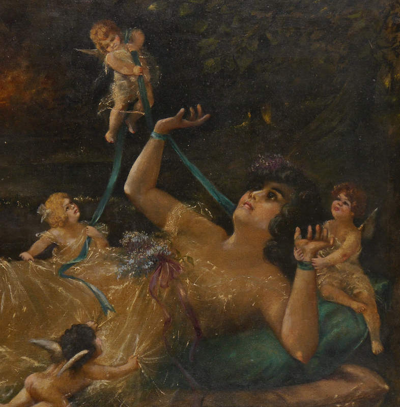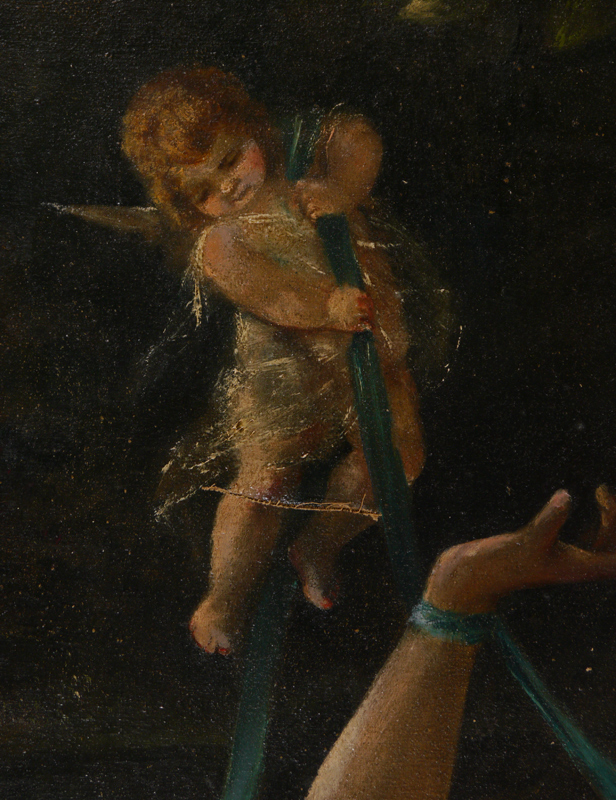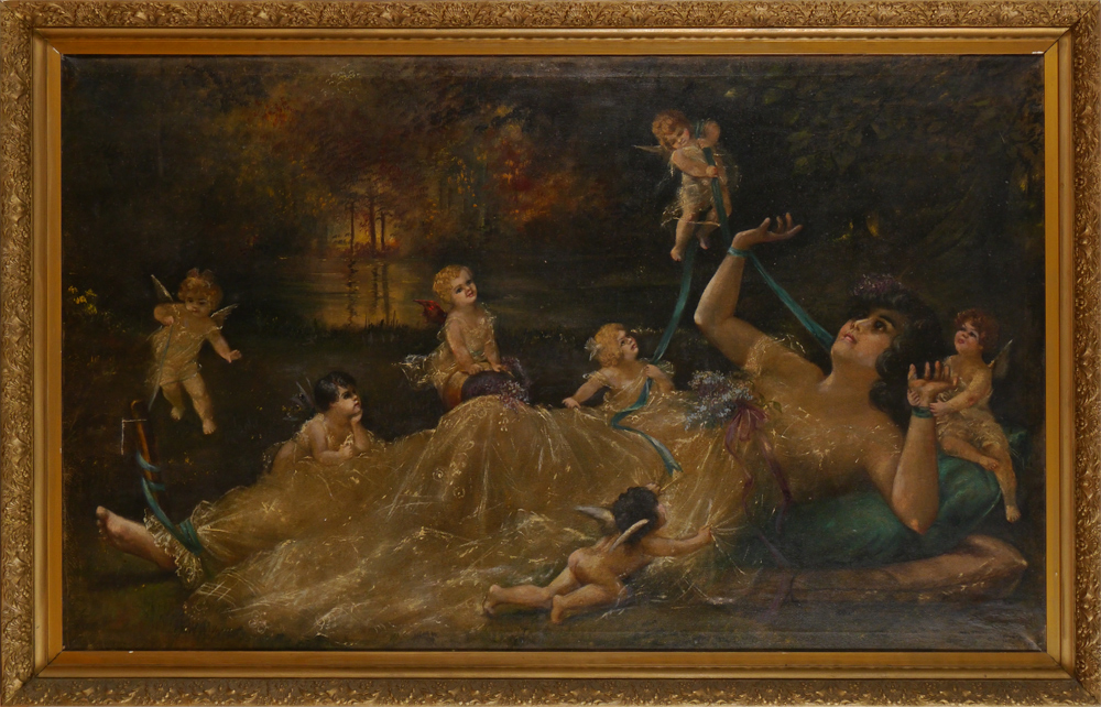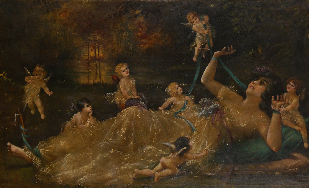 LARGE STEWART FLETCHER AFTER THE ANTIQUE PAINTING OF PUTTI AT PLAY: 35 1/2'' x 58'', framed 42'' x 63 1/2'', dated 1919.