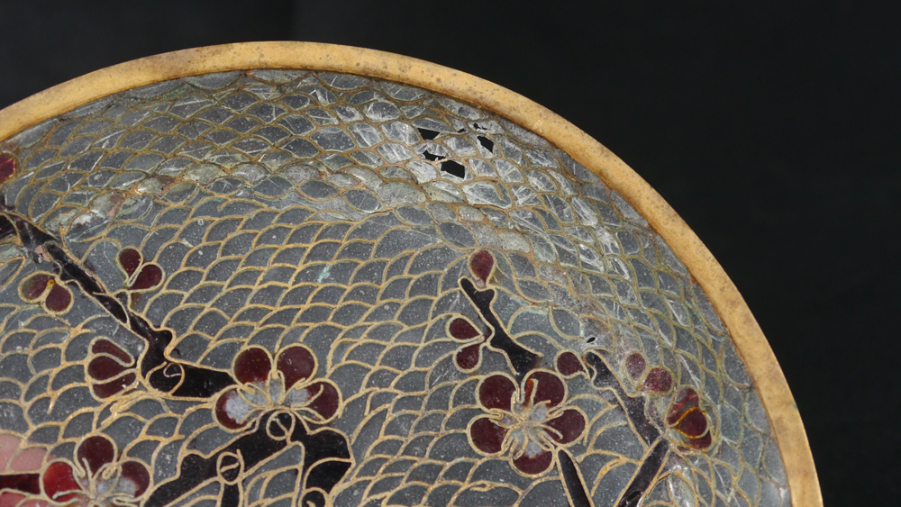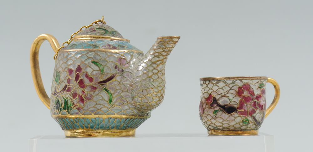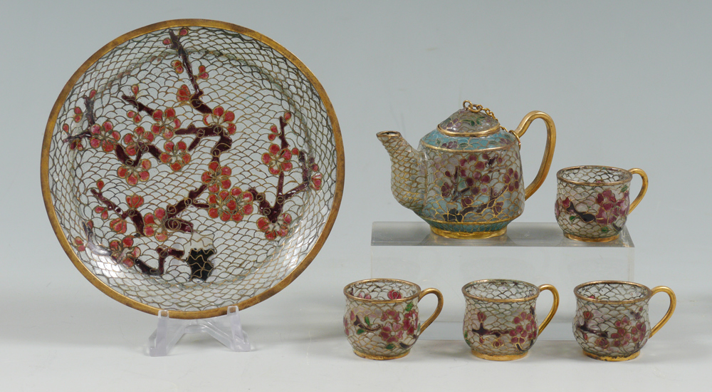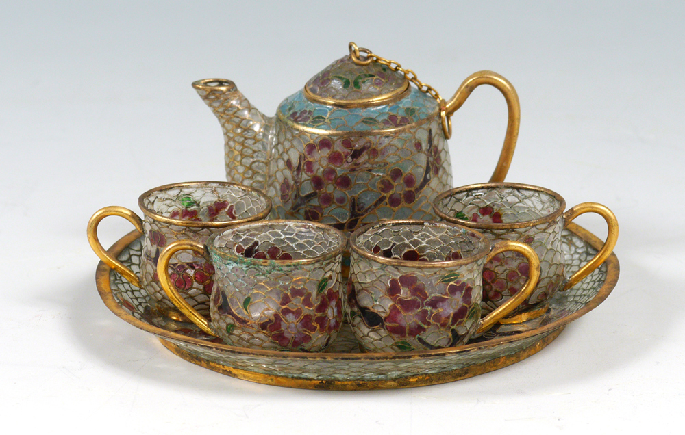 MINIATURE PLIQUE-A-JOUR TEA SET: 6 pieces total, miniature or doll sized tea set with floral and fish scale motifs to include teapot 2'' h. x 3'', 4 cups, serving tray 4 1/2'' dia.