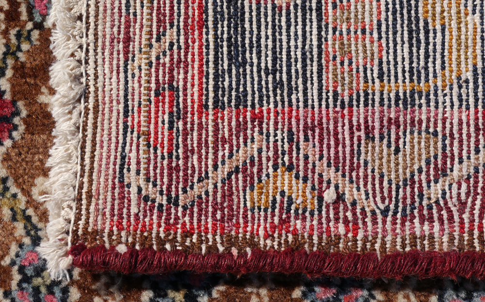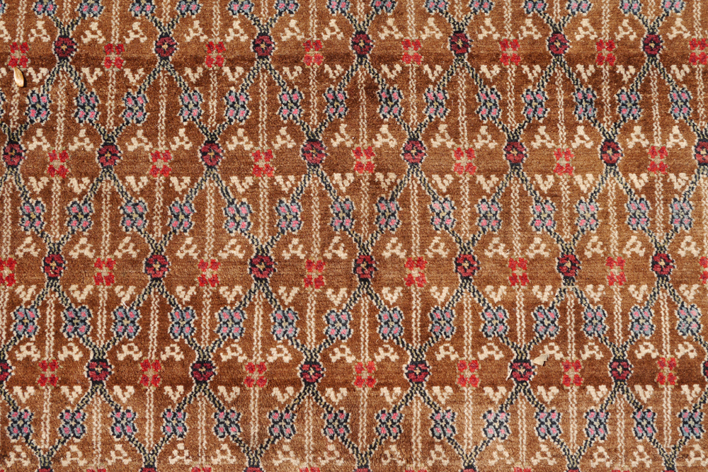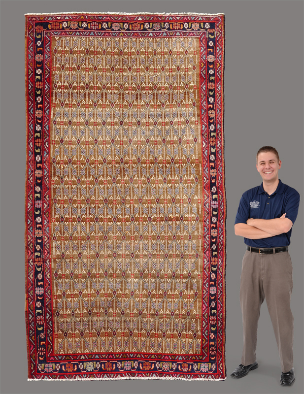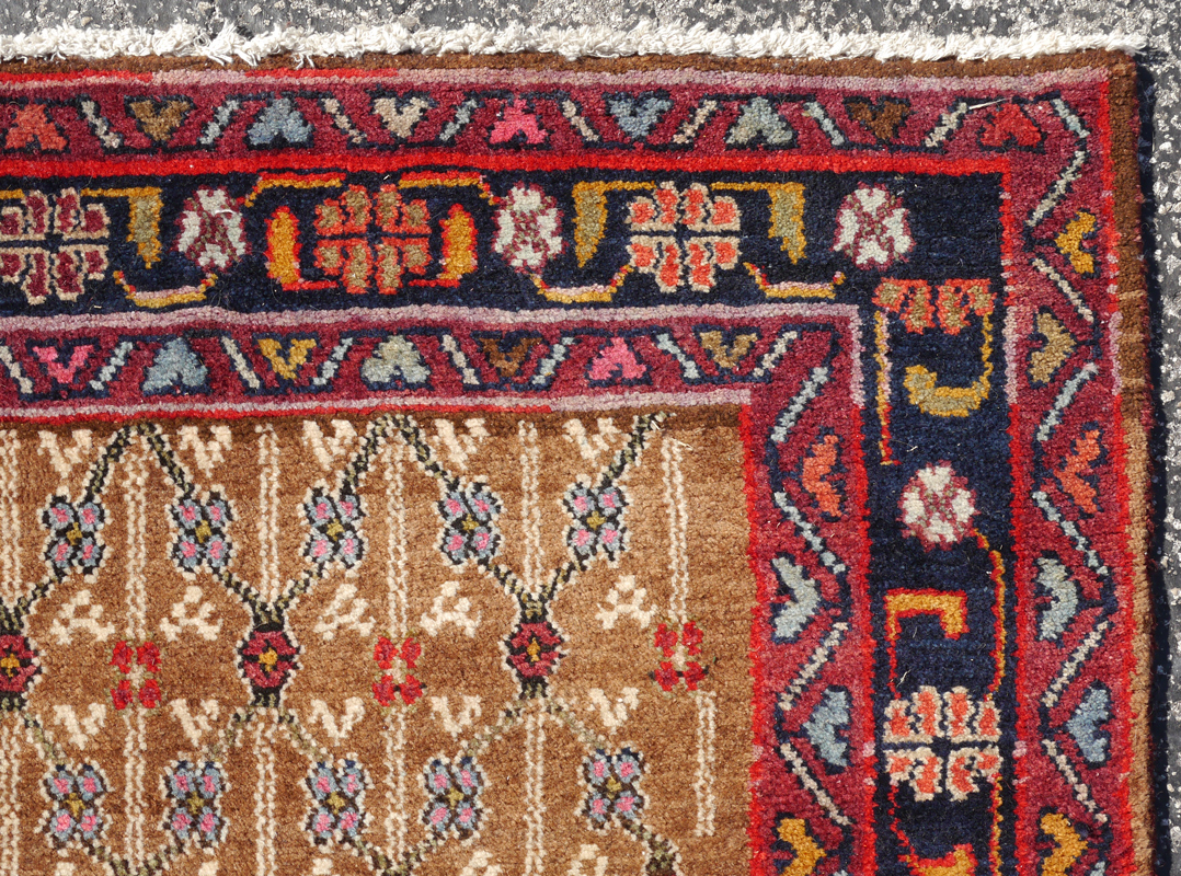 APPROX. 20-35 YR. OLD PERSIAN HAMADAN HAND KNOTTED WOOL RUG, 5'1'' x 9': This Persian rug has a brown field that looks like natural undyed wool like older ''Camel-hair'' Hamadans. The field is covered with a repeating overall design in black, reds, white, and blue straight line ''vines'' that create a grid work of diamond outlines. The darker colored borders finish and frame the field. Condition is good.
