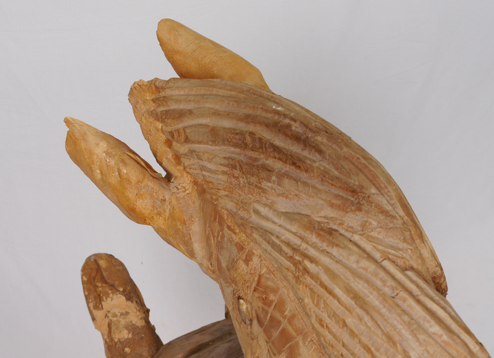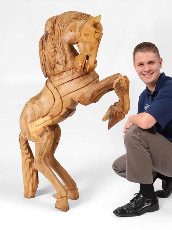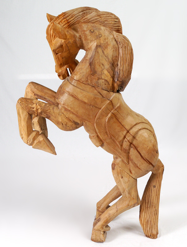 LARGE FOLK ART CARVED HORSE: Wood figure of a rearing horse, no visible signature. Overall measures 52'' h. x 33'' x 12''.
