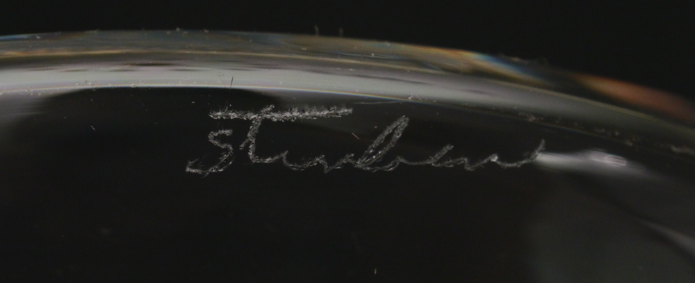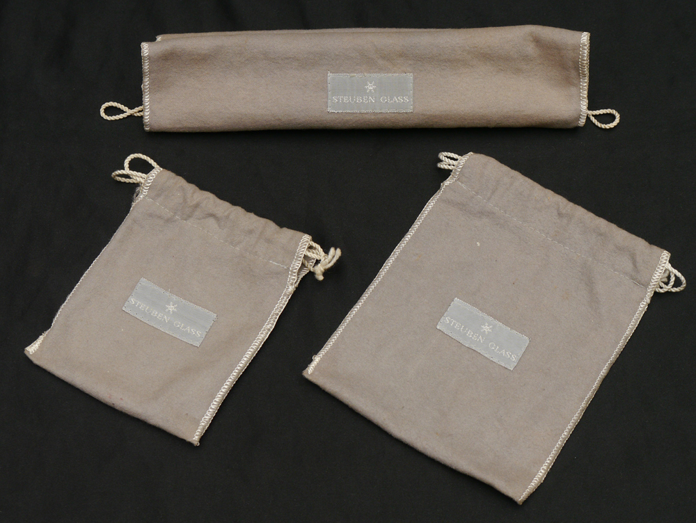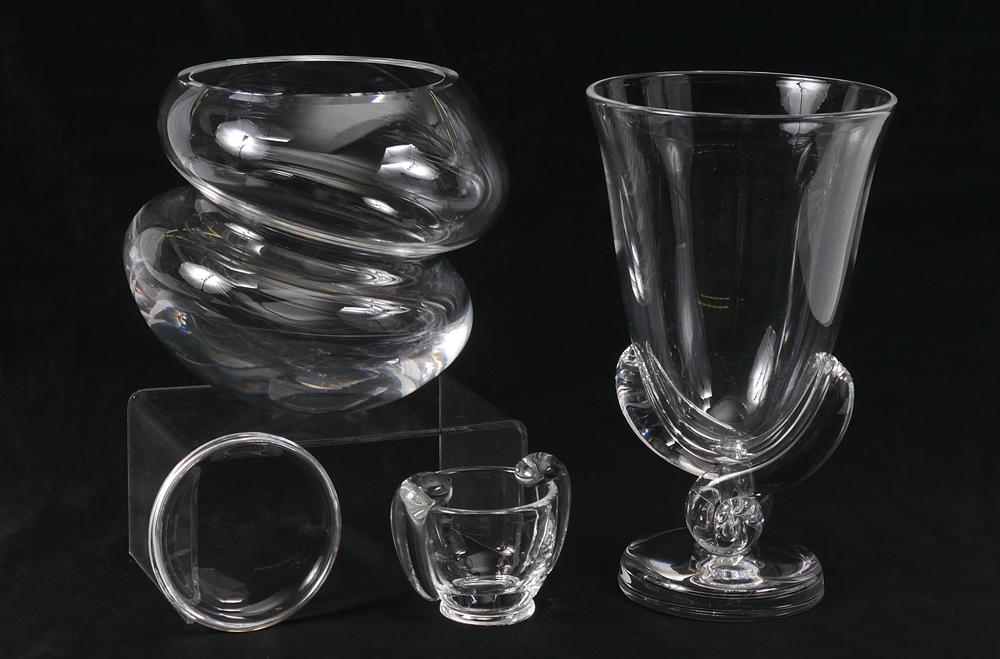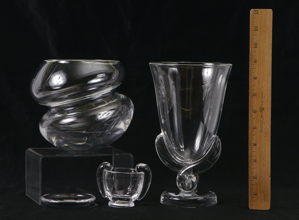 4 PIECE STEUBEN GLASS COLLECTION: To include 1) Freeform double globe form, signed, 5 3/4'' h. x 6 1/4''. 2) Footed vase with swirl pedestal, signed, 8 3/4'' h. x 5 1/2''. 3) Small handled glass, signed, 2 1/2'' h. 4) Small dish, signed, 3 3/8''. Sold with 3 Steuben grey cloth bags.