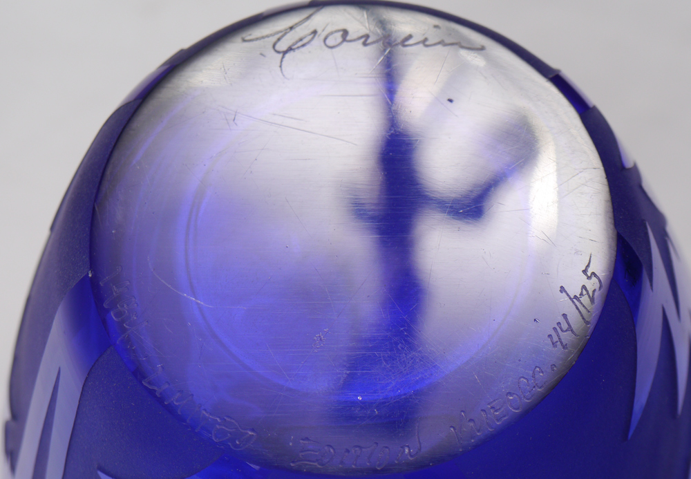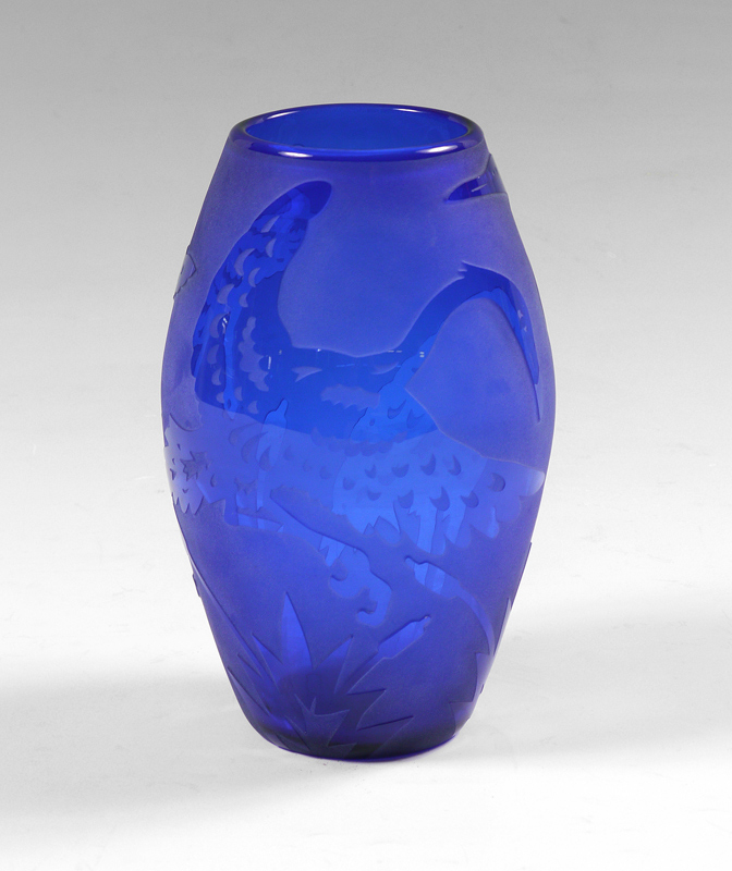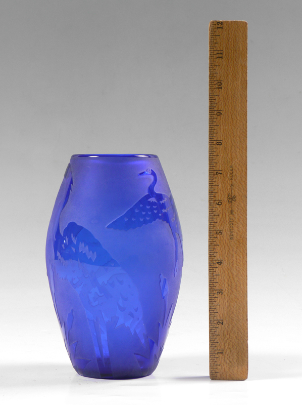 CORREIA COBALT ART GLASS CAMEO VASE: Frosted ground with figural cranes, marked on base Correia, 1984, Limited Edition VMEOOC, 44/125. 7 1/2'' h. x 4 3/4''.