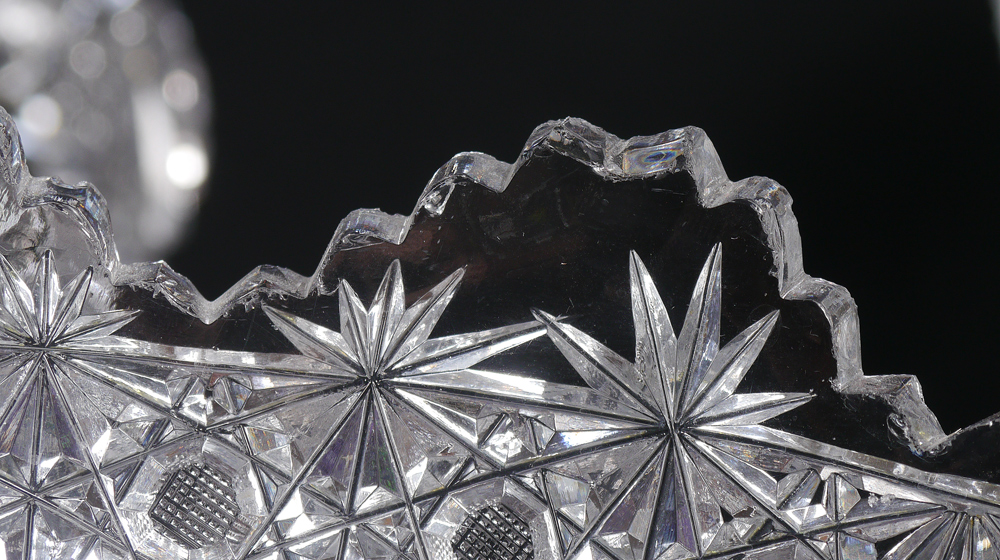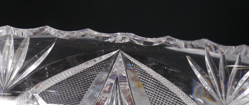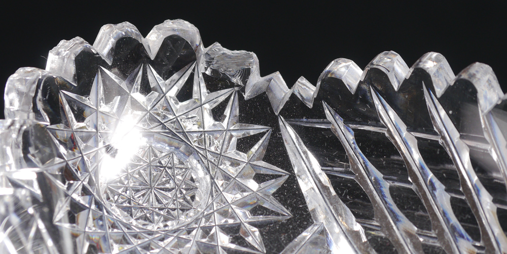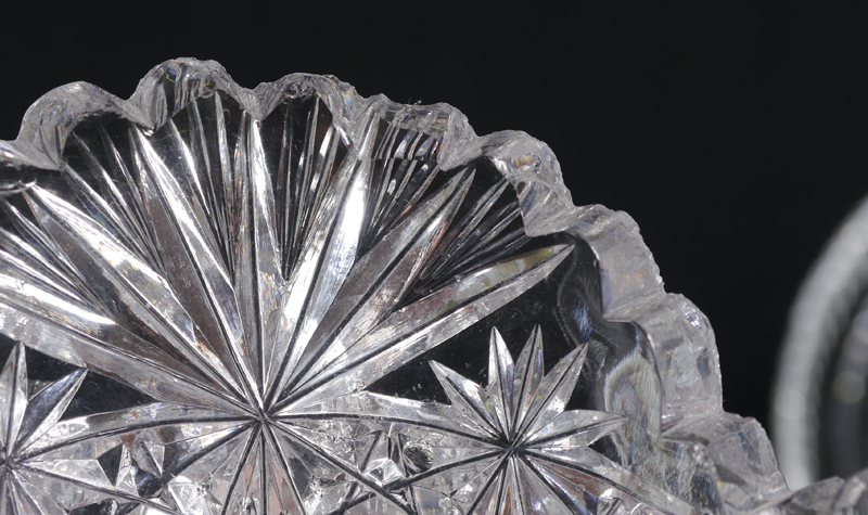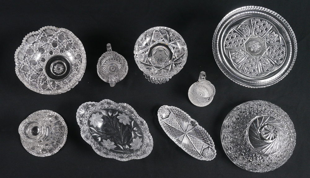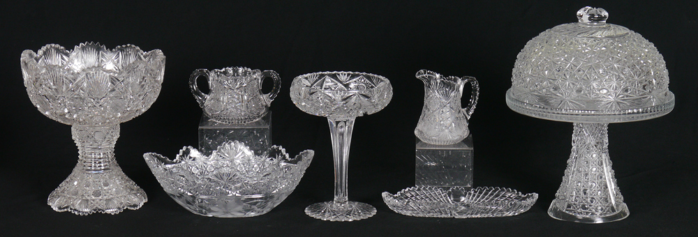 7 PIECE ESTATE CUT GLASS COLLECTION: An assembled collection to include 1) Pedestal cake plate with dome top, 14'' h. x 11 1/4''. 2) Compote, 9 1/4'' h. x 7''. 3) 2 piece punch bowl on pedestal, overall 11'' h. x 10''. 4) Oval serving bowl, 4 1/4'' h. x 11 3/4'' x 8''. 5) Oval dish, 10 3/4'' x 4 1/2''. 6) Open double handle sugar, 3 1/2'' x 6 1/2''. 7) Open creamer, 5'' h. x 4 3/4''.