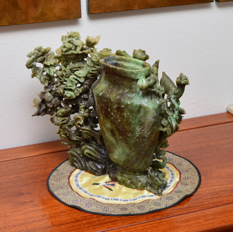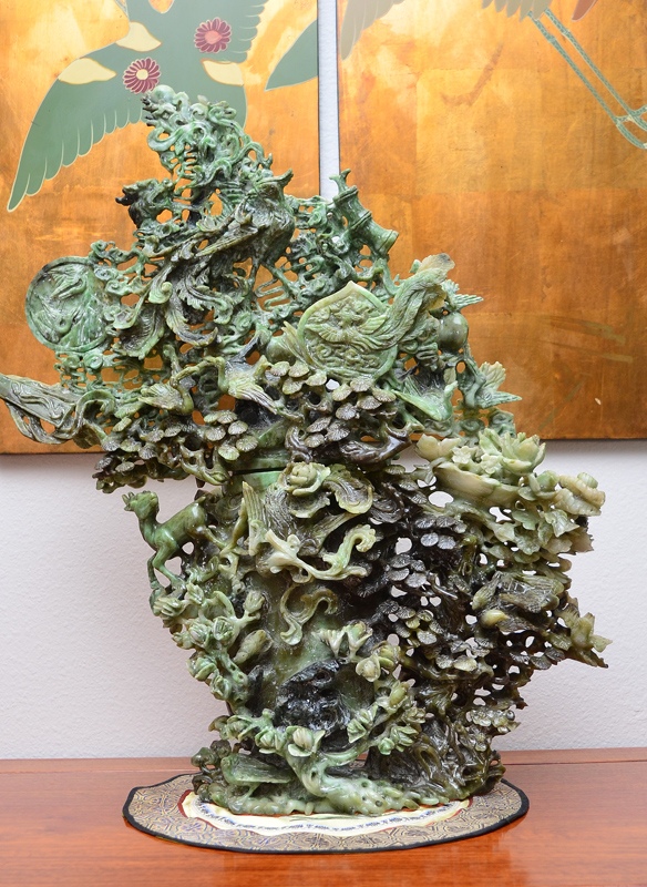 PROFUSELY CARVED CHINESE SERPENTINE COVERED JAR: Carved all over with animal figures, medallions, birds and foliate motifs. Overall measures 21 1/2'' h. x 18 1/2'' x 4 1/2''.