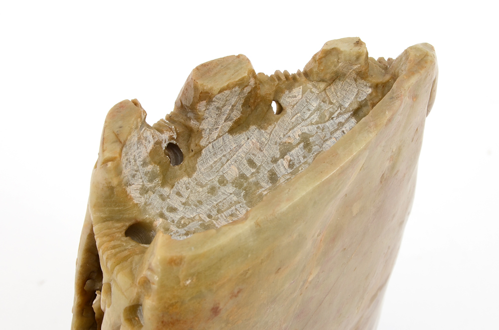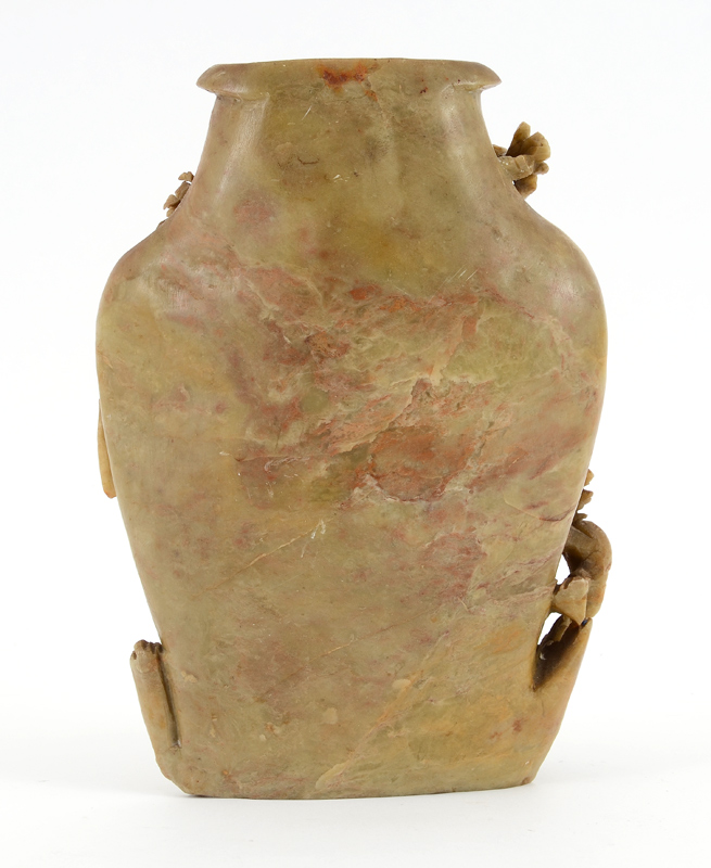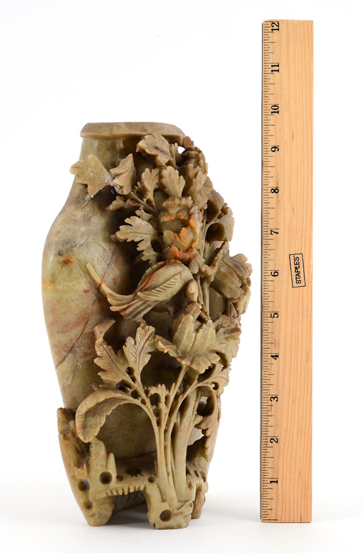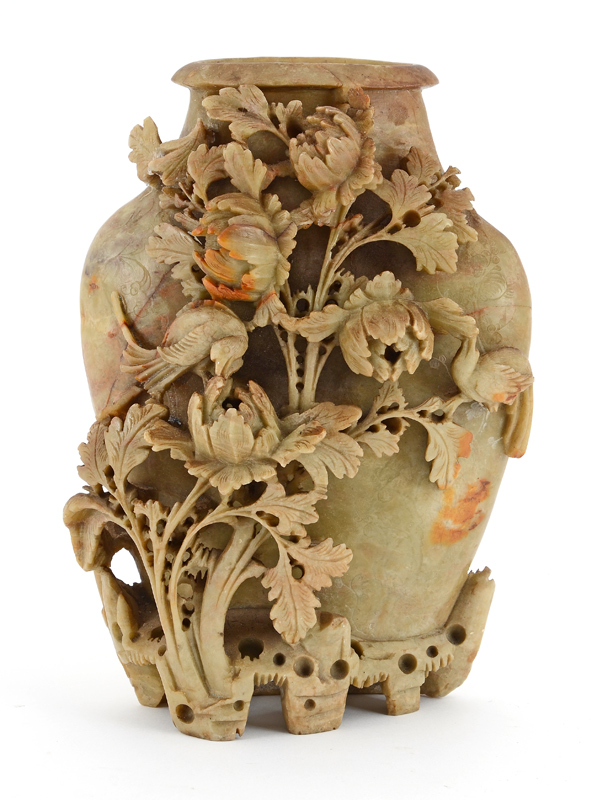 CARVED CHINESE SOAPSTONE VASE: Carved with floral motifs, 9 1/2'' x 7'' x 3 3/4''.