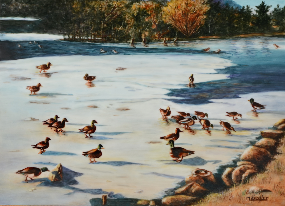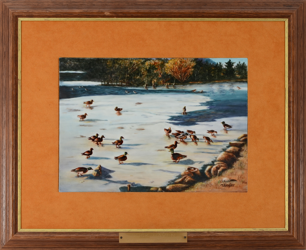 ZIEGLER, Mary Lois, (American, 20th C): ''Duck Haven'', painting on porcelain, sight size 10'' x 14'', signed lower right, framed, 19'' x 22 1/2''.