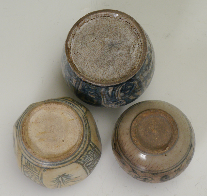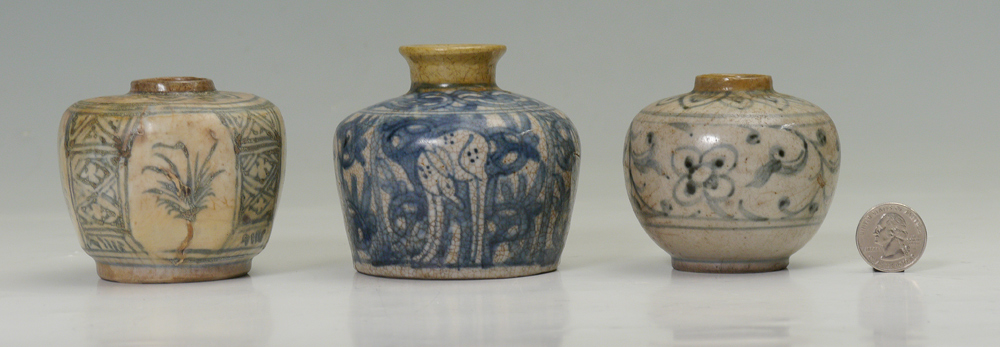 3 CHINESE EARTHERNWARE BOTTLES OR STORAGE JARS: 3 pieces total blue decorated Chinese or Korean jars to include 1) Stylized deer and foliate motif, 3 1/8'' h. x 3 1/2''. 2) Floral motif, 2 7/8'' dia. 3) Floral motif, 3''.